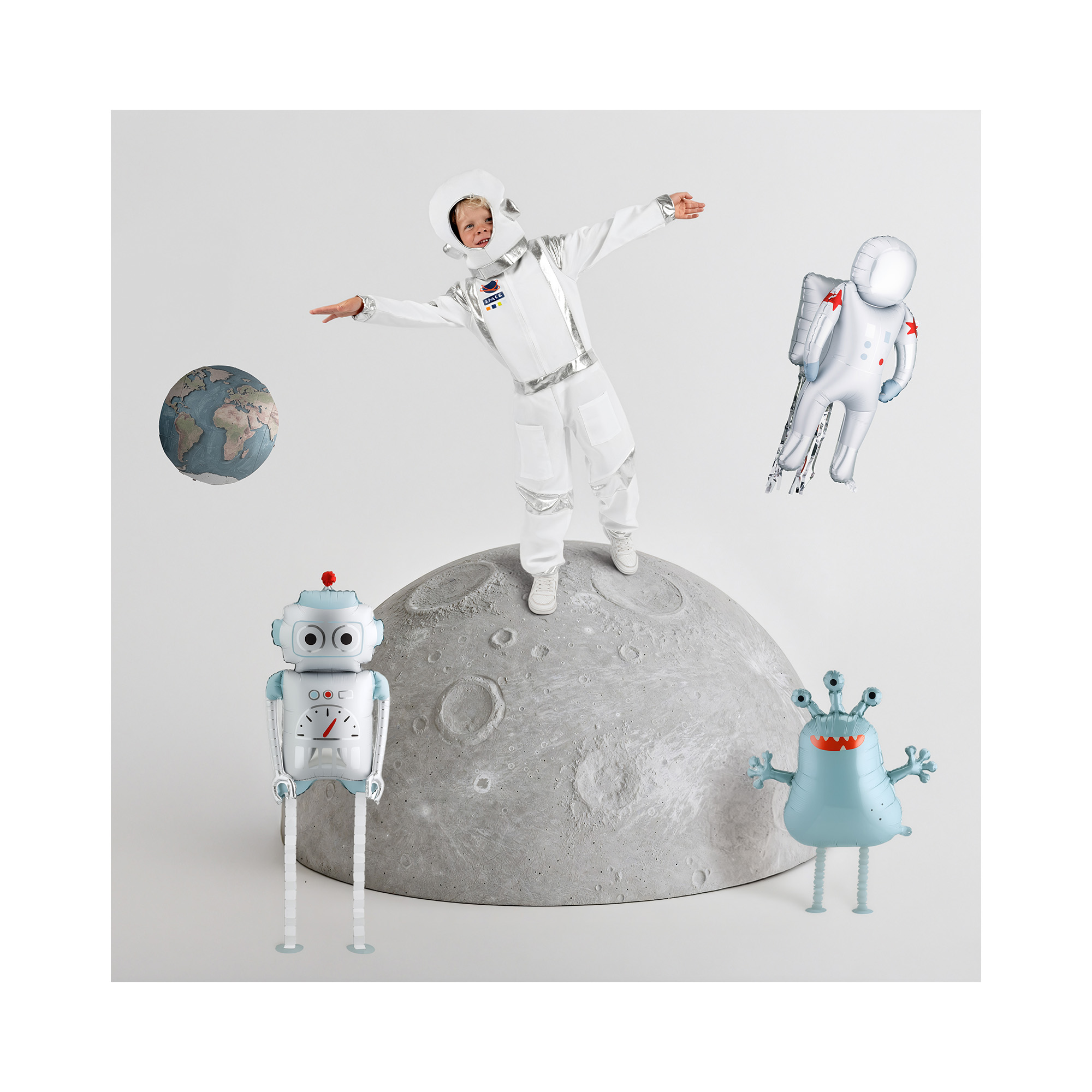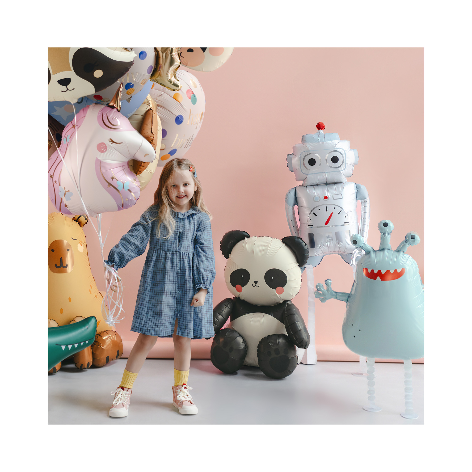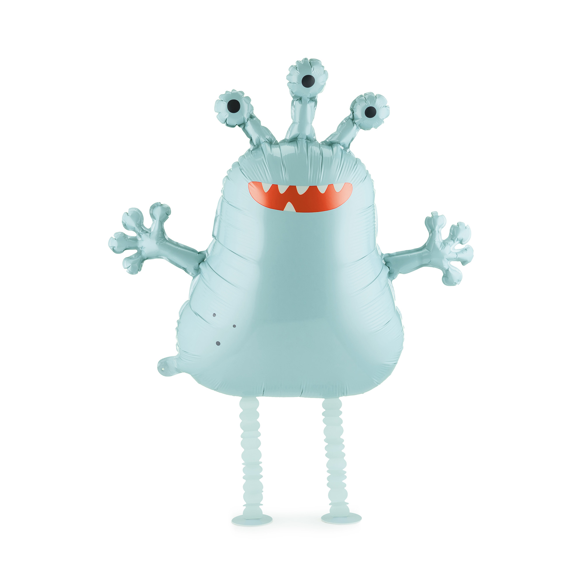 Chodící fóliový balónek ve tvaru mimozemšťana je skvělou volbou pro originální výzdobu i zábavu na dětské párty nebo tematické narozeninové oslavě. Balónkový mimozemšťan má pastelově modrou barvu, z hlavy mu vykukují tři oči a k tělu má připevněné papírové nožičky. Nechte balónek volně pobíhat po zahradě, nebo ho využijte jako zábavný prvek pro děti. Přivažte k němu provázek a nechte děti, aby se s ním procházely. Další vesmírné doplňky a dekorace najdete v naší tematické kategorii Vesmír. Rozměry: 58 × 60 cm po nafouknutí (82 × 74,5 cm před nafouknutím), výška nožiček je cca 25 cm Materiál: fólie Balení obsahuje: 1 ks balónku s nožičkami a brčko pro snadné nafouknutí Balónek je možné nafukovat vzduchem i heliem. Pro docílení „chodícího efektu“ je třeba jej nafouknout heliem.