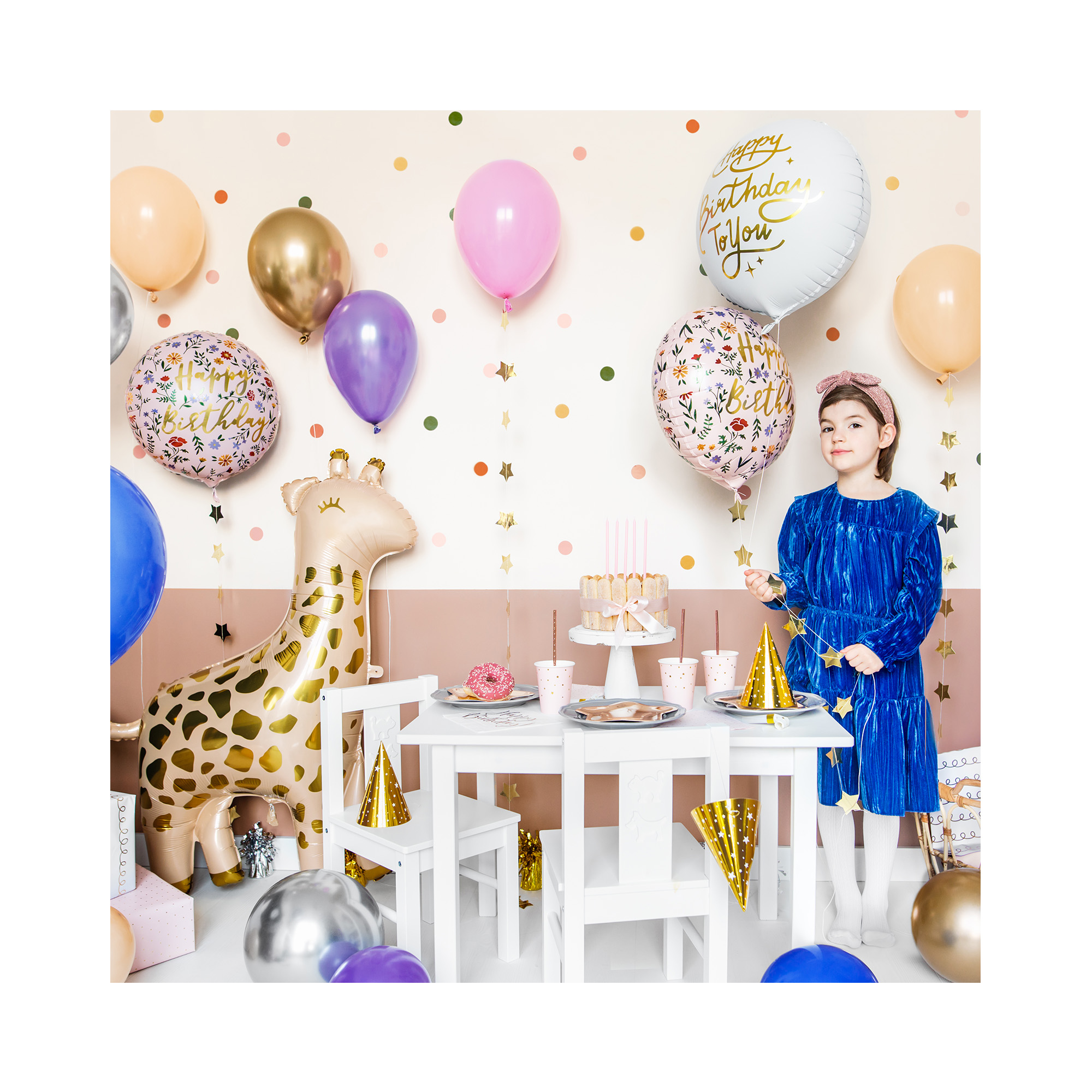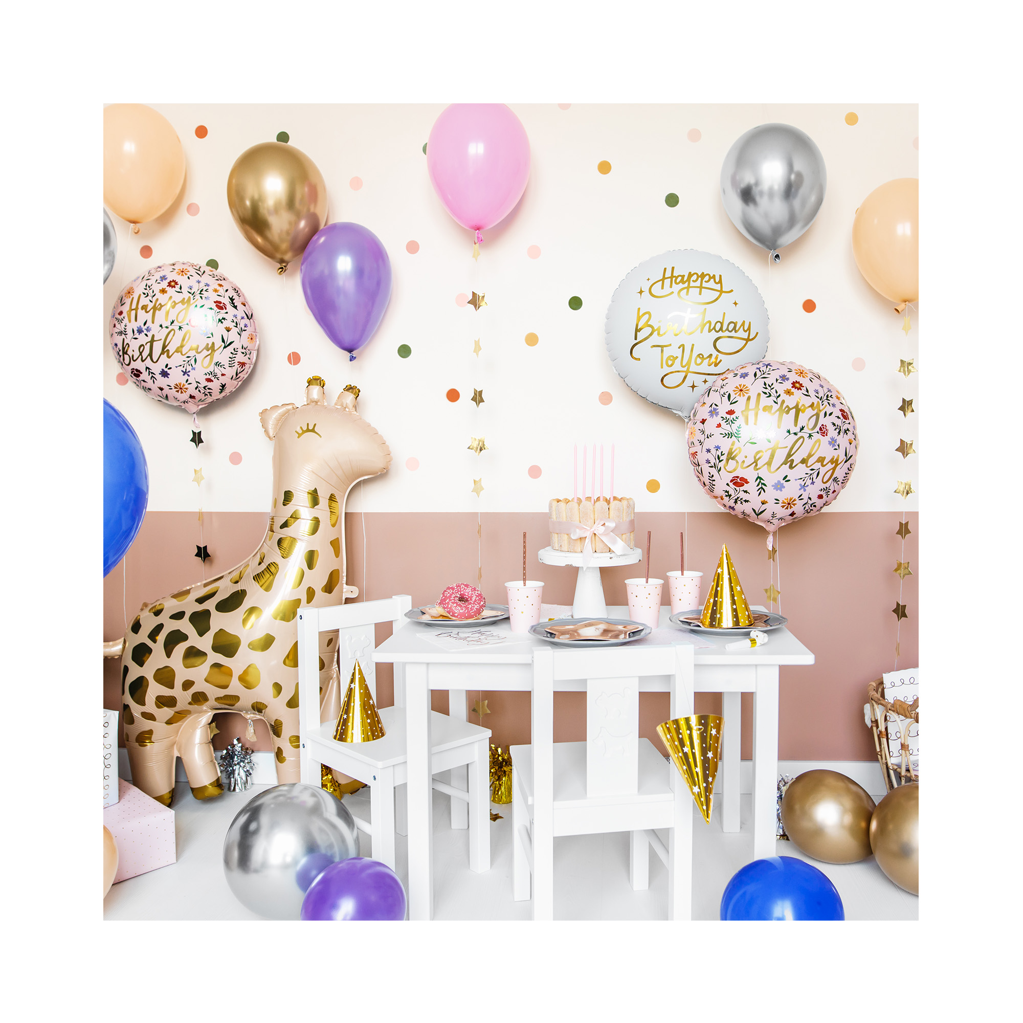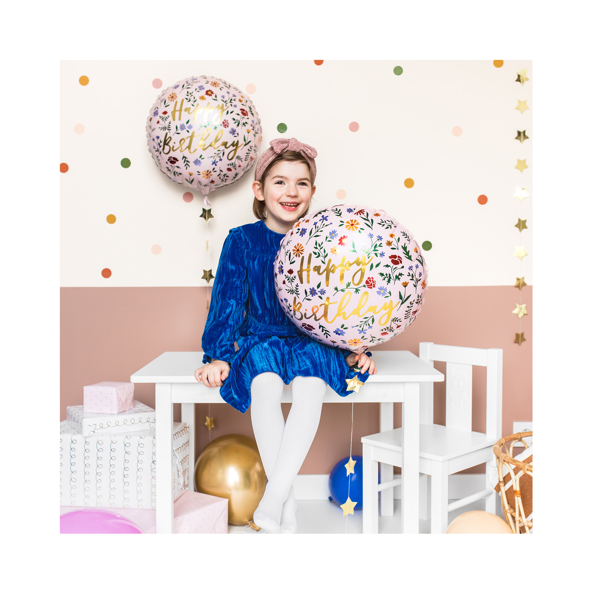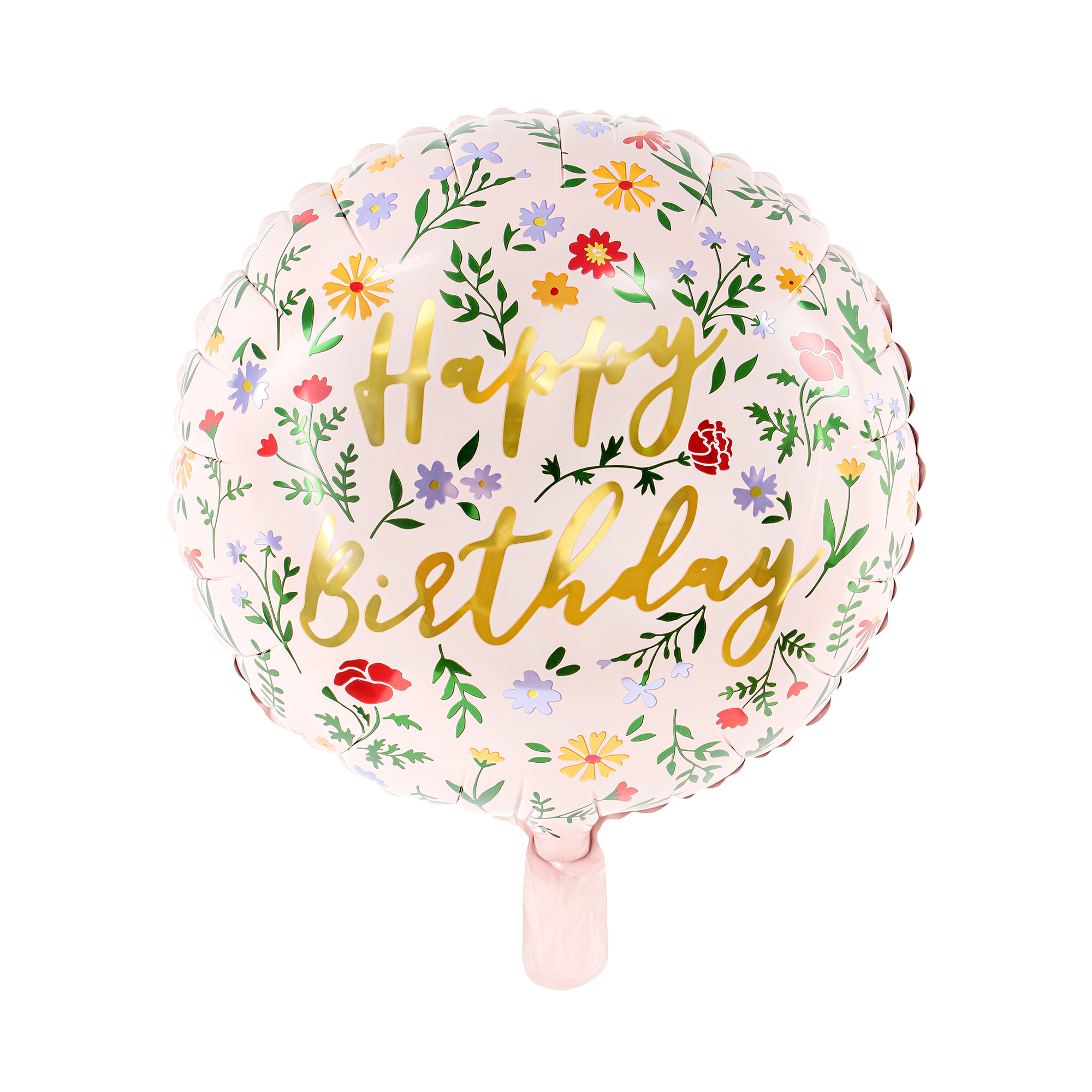 Kulatý fóliový balónek s nápisem "Happy Birthday" a potiskem lučního kvítí.  Tento balónek má v podkladu jemnou růžovou barvu a potěší, každou ženu či dívku.  Velikost/rozměr: 14 " – 35,5 cm Materiál: pevná fólie Balení obsahuje: 1 ks Balónky je možné nafukovat vzduchem i heliem.