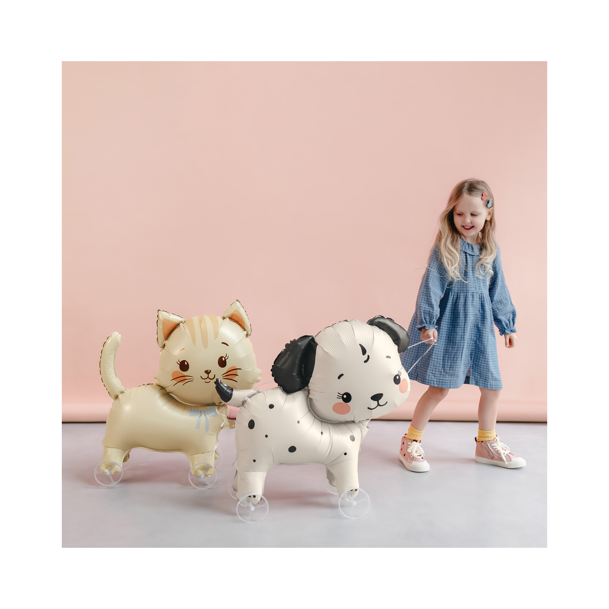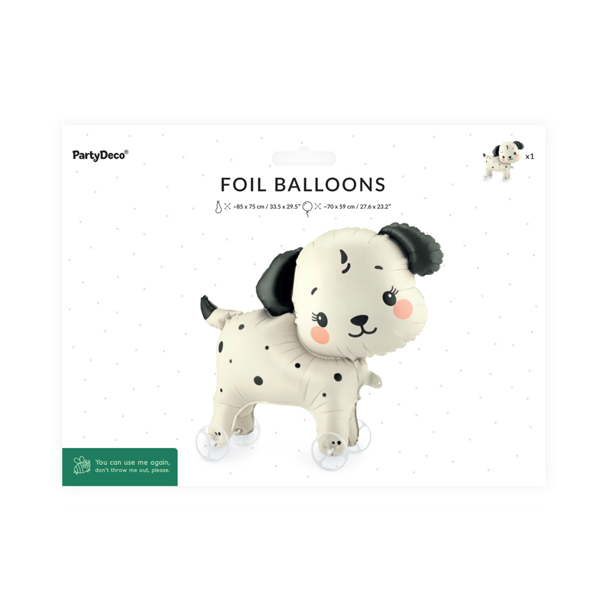 Fóliový balónek na kolečkách ve tvaru roztomilého dalmatina zaručeně potěší všechny děti. Tento originální balónek se jistě stane oblíbenou dekorací a zábavou na dětských narozeninových oslavách a tematických párty. Přivažte k balónku provázek a nechte děti, aby se s ním procházely. Balónkový pejsek má světlou barvu s typickými černými puntíky, usměvavý obličej a černá ouška. Pro další párty doplňky a dekorace v psím motivu můžete navštívit naši tematickou kategorii Zvířátka. Rozměry: 70 × 59 cm po nafouknutí (85 × 75 cm před nafouknutím) Materiál: fólie Balení obsahuje: 1 ks balónku, kolečka, stuhu a brčko pro snadné nafouknutí Balónek je možné nafukovat pouze vzduchem.