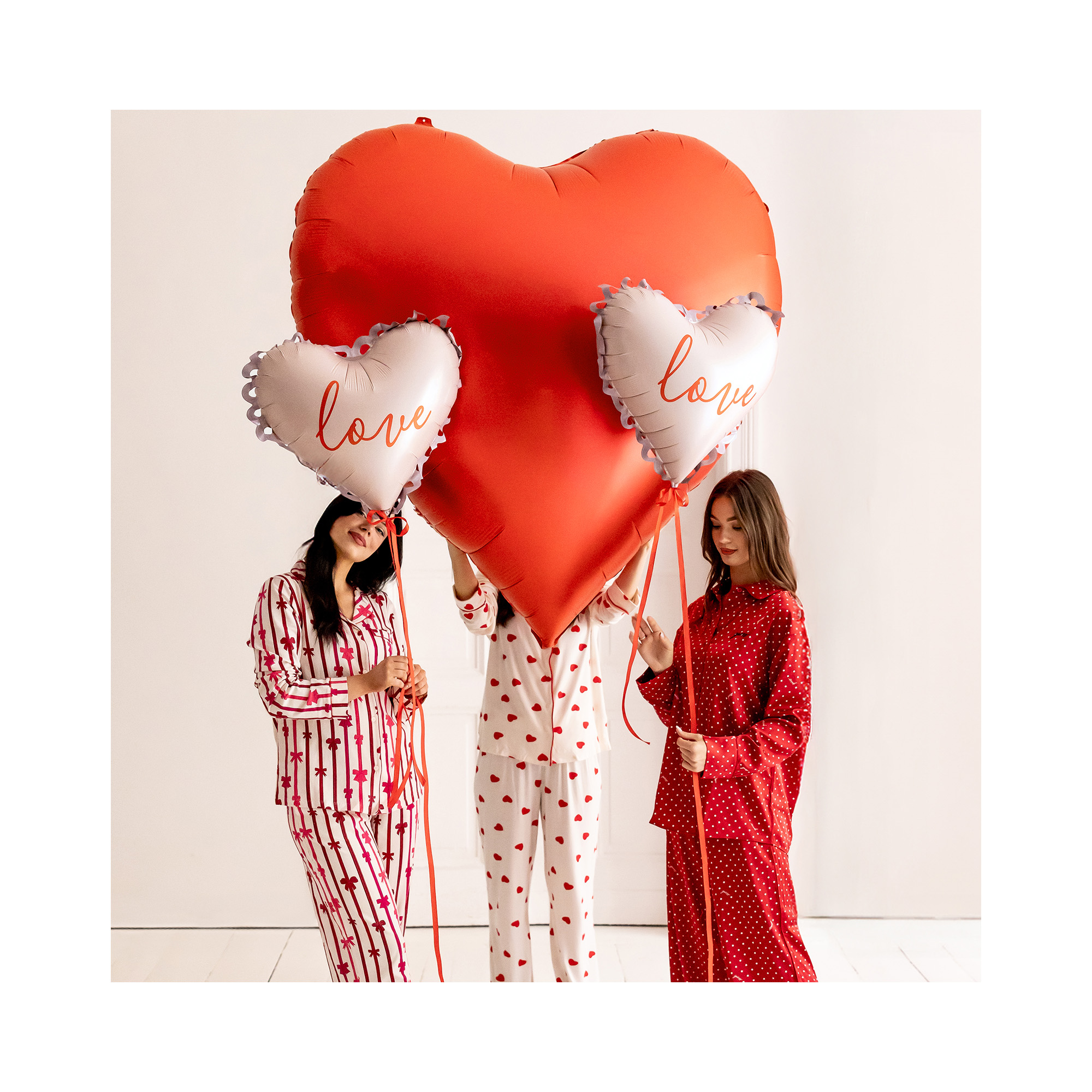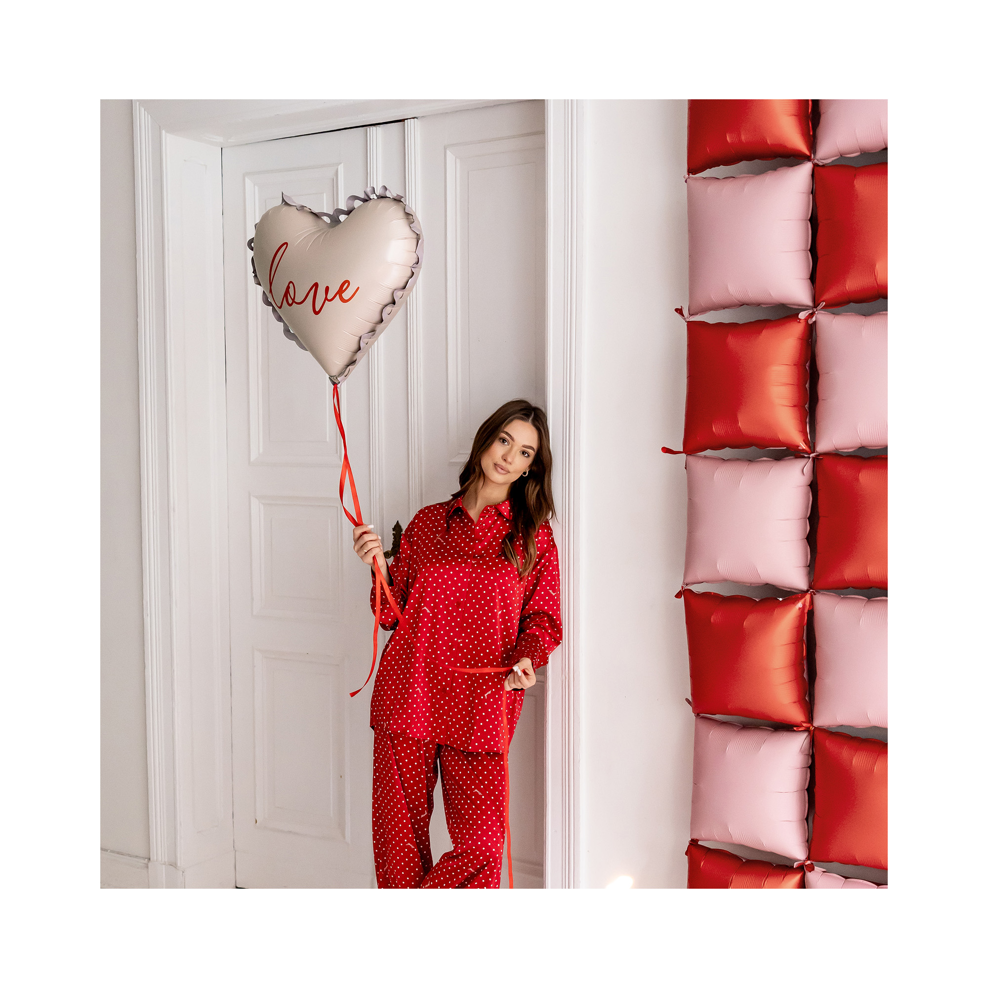 Fóliový balónek ve tvaru srdce v matné pudrové barvě je vhodný jako jemná dekorace na svatbu, k vyznání lásky nebo na oslavu sv. Valentýna. Srdce je zdobené děrovanými volánky a nese červený nápis „Love“. Můžete jej snadno zkombinovat s dalšími balónky a vytvořit tak pestrou balónkovou kytici, která bude efektním prvkem každé oslavy, párty nebo fotokoutku. Další zamilované párty doplňky a dekorace najdete v naší kategorii Valentýn/láska. Rozměry: 50 × 47 cm po nafouknutí (67 × 56,5 cm před nafouknutím) Materiál: pevná fólie Balení obsahuje: 1 ks balónku a papírové brčko pro snadné nafouknutí Balónek je možné nafukovat vzduchem i heliem.