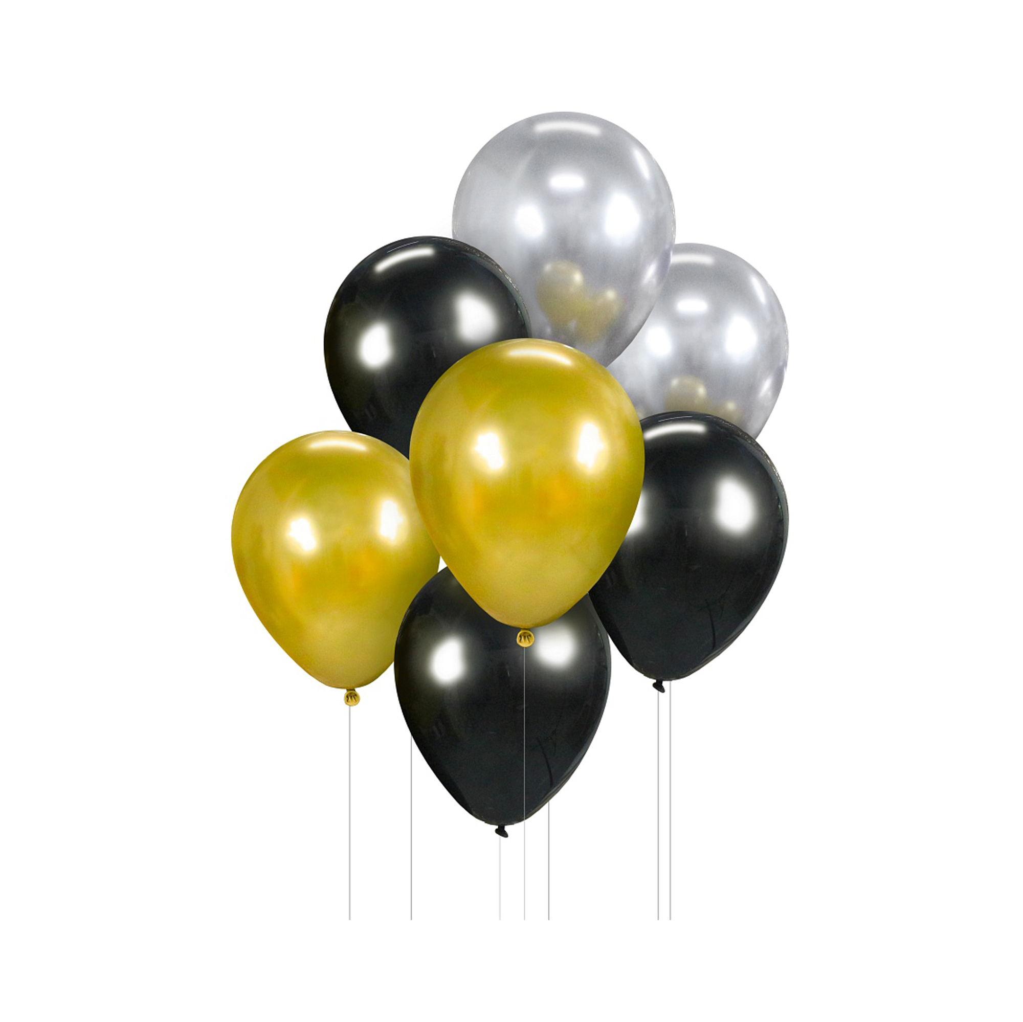 Set latexových balónků v elegantních barvách pro slavnostní výzdobu tematické párty, vánočního večírku či silvestrovské párty.  Mix balónků v černé, zlaté a stříbrné barvě. Rozměr: 12" – 30 cm Materiál: latex Balení obsahuje: 7 ks latexových balónků Balónky je možné nafukovat vzduchem i heliem.