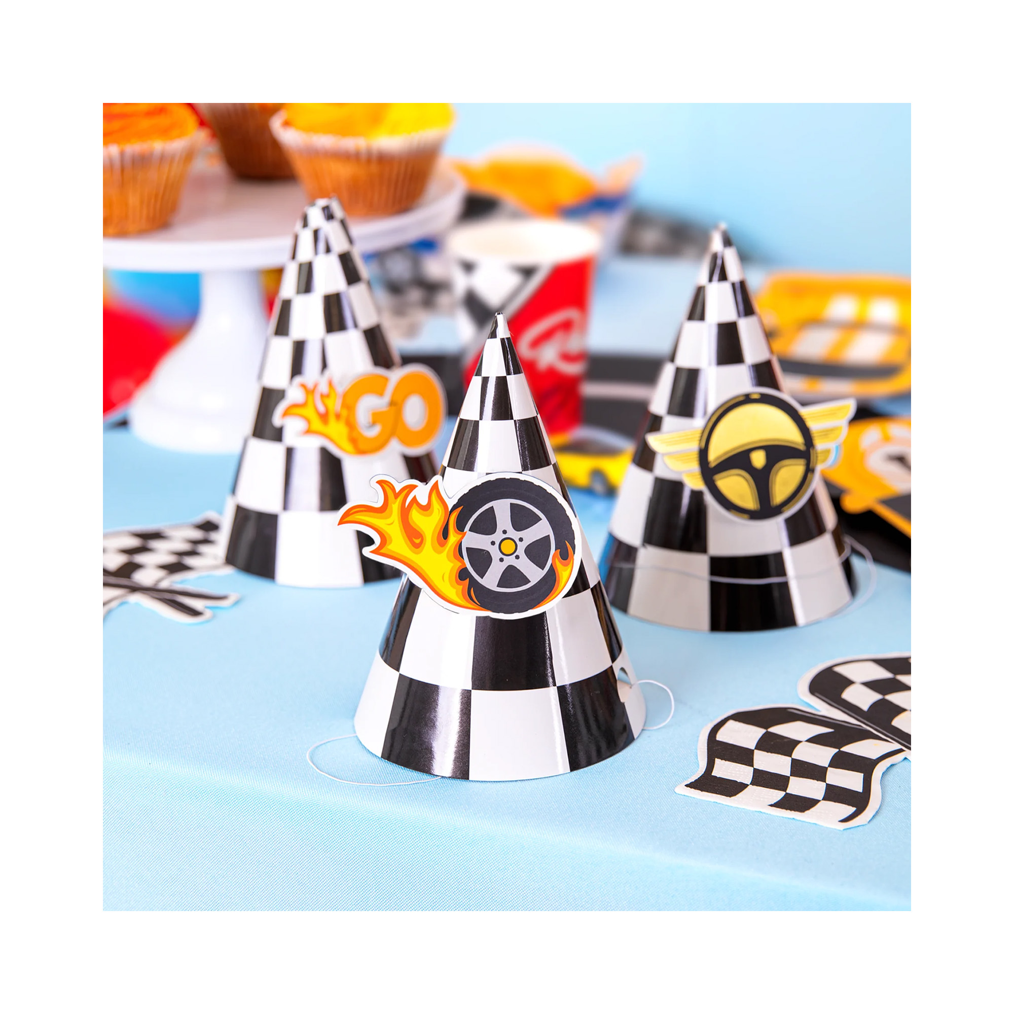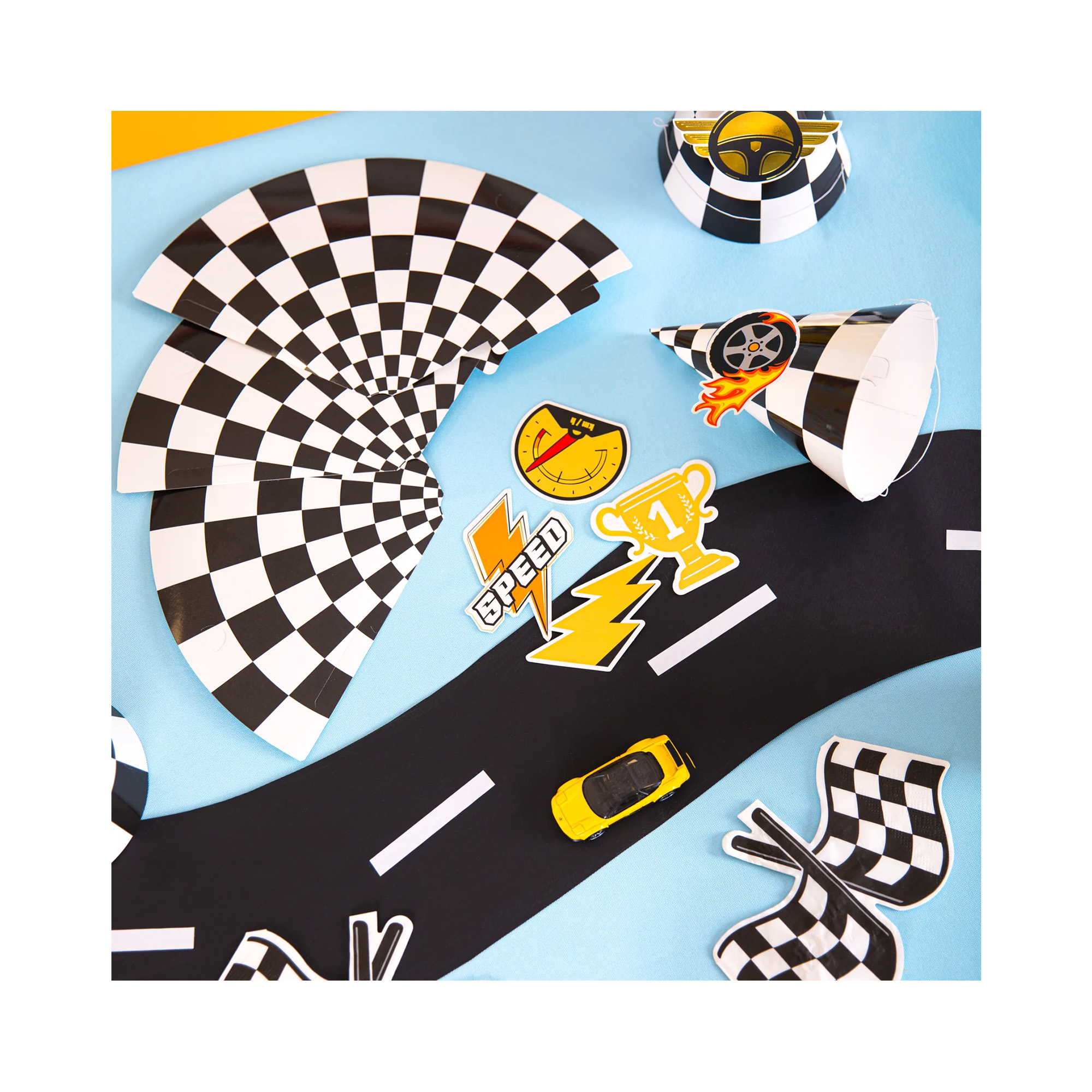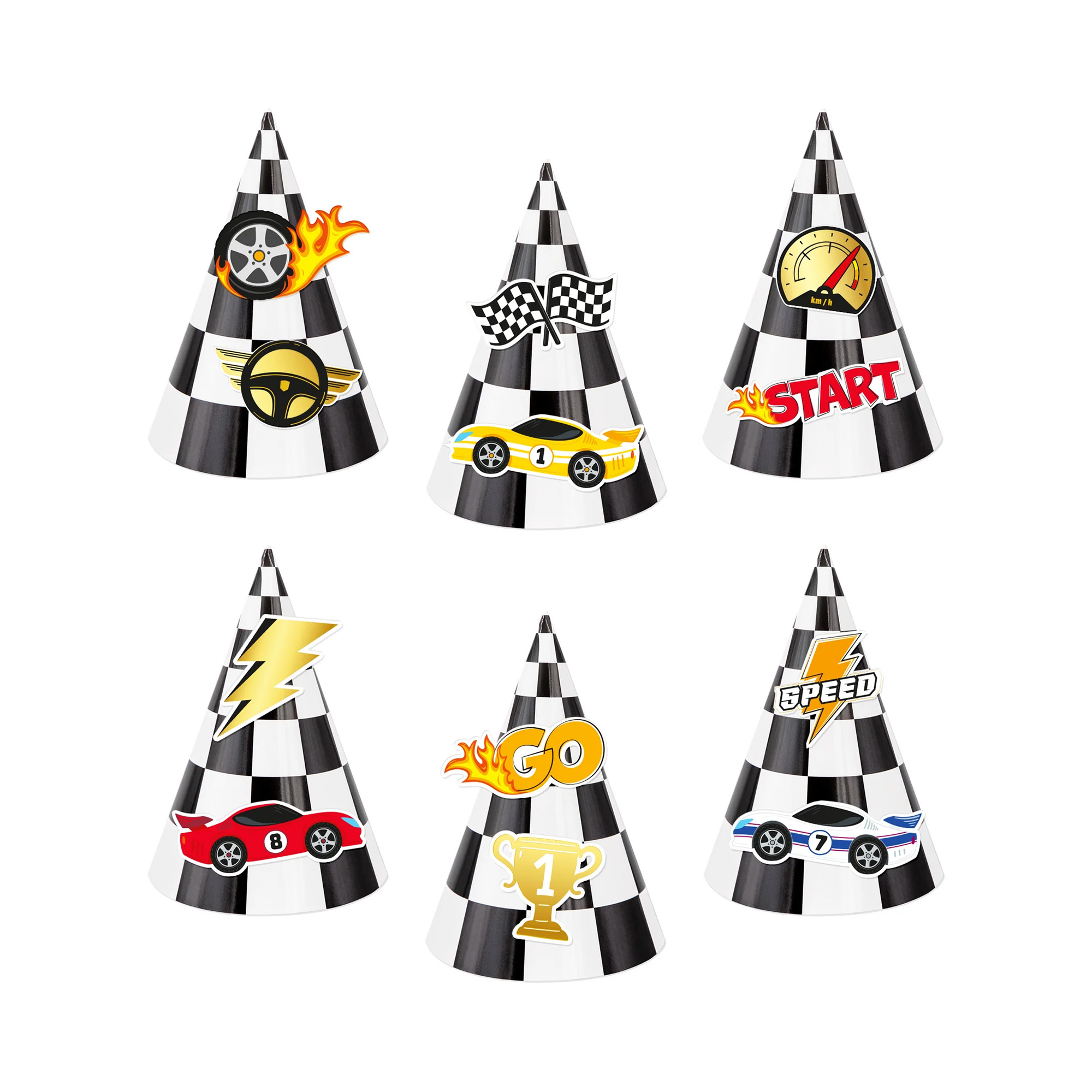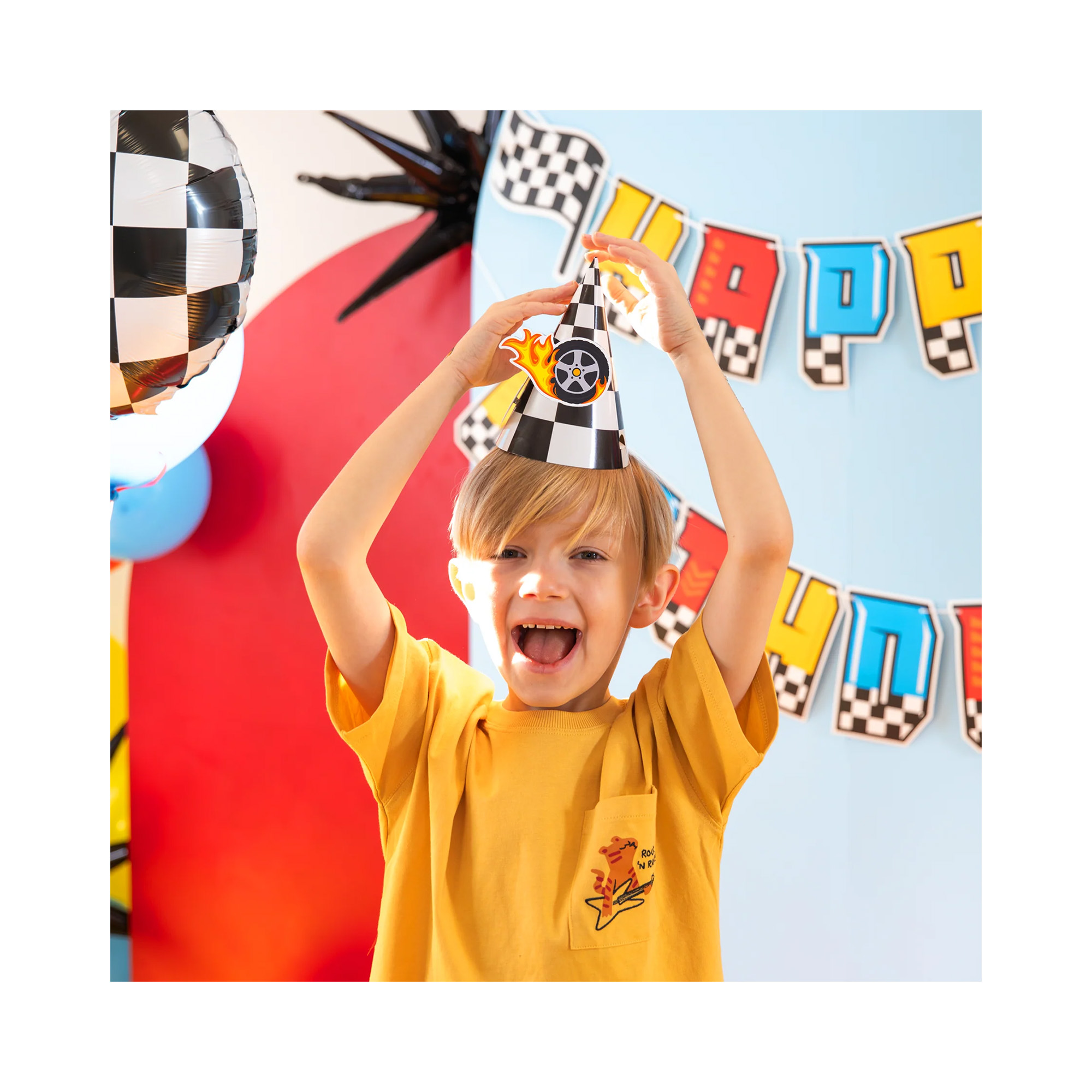 Balení šesti papírových čepiček laděných do závodního stylu je veselým doplňkem pro tematickou chlapeckou oslavu. Sada se skládá z černobílých šachovnicových čepiček, mixu dvanácti tvarů se závodním motivem, dvaceti lepicích teček, jejichž pomocí můžete tvary na čepičky snadno připevnit, a šesti gumiček, aby čepičky na každé hlavě hezky a stabilně držely. Tyto čepičky jsou součástí kolekce Závodní auta a potěší všechny, kterým je blízké téma formulí, rally a rychlých kol. Skvělý doplněk dekorace pro tematickou narozeninovou oslavu nebo párty! Další závodní párty doplňky a dekorace najdete v naší kategorii Auta/stavba. Průměr: 10 cm Výška čepičky: 16 cm Balení obsahuje: 6 ks čepiček, 12 ks tvarů, 20 ks lepicích teček a 6 gumiček