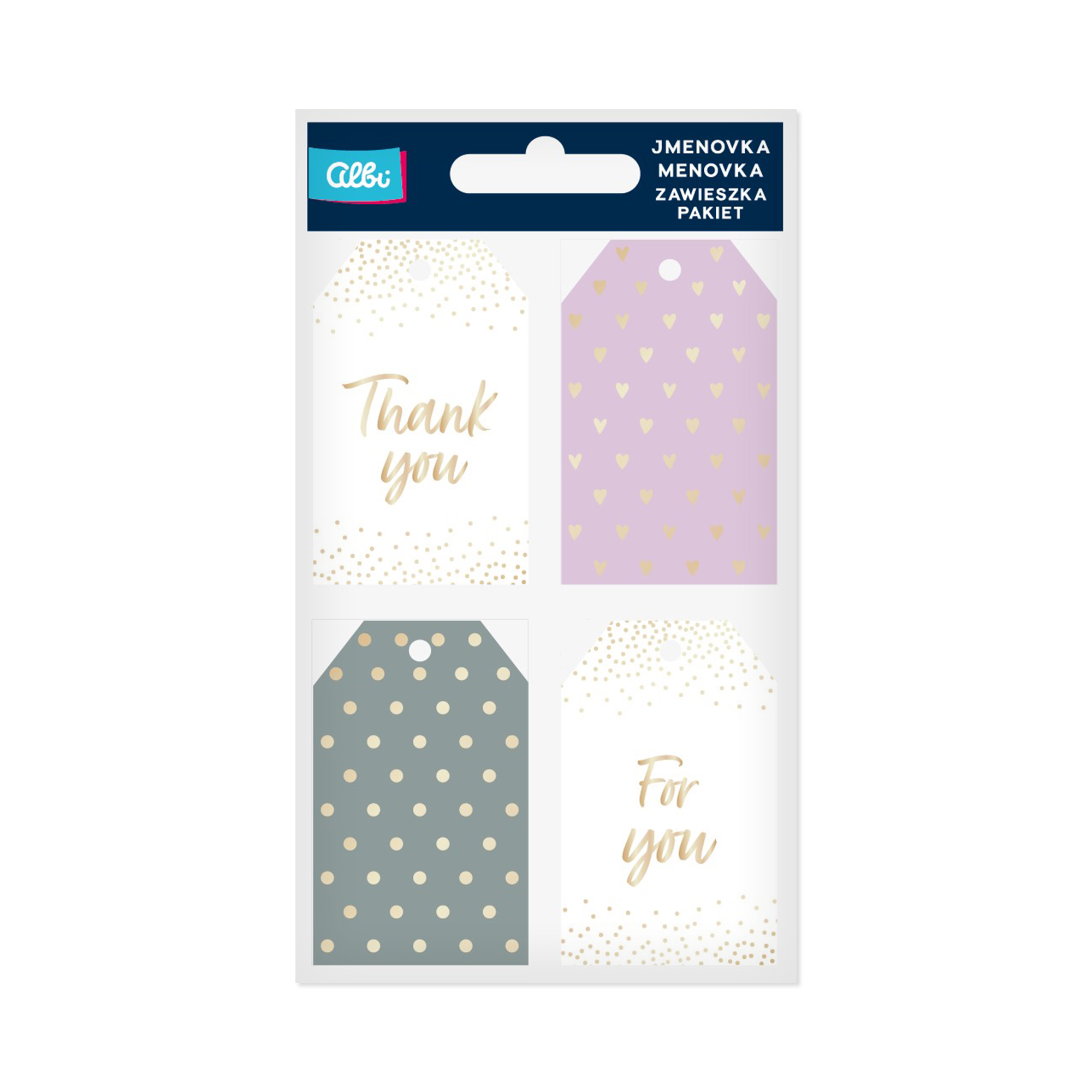 Plánujete dárek zabalit do balicího papíru a potřebujete ho nadepsat jménem? Vyvarujte se psaní jména fixou přímo na papír a zvolte raději stylové visací jmenovky. 12 kusů papírových jmenovek na dárek se zlatou ražbou a puntíkatým motivem na jedné straně, nabízí z druhé strany prostor pro vepsání jména či věnování. Navíc dárek krásně dozdobí. Balení obsahuje 4 různé motivy vždy po 3 kusech. Rozměry dárkových jmenovek: 8 × 5 cm
