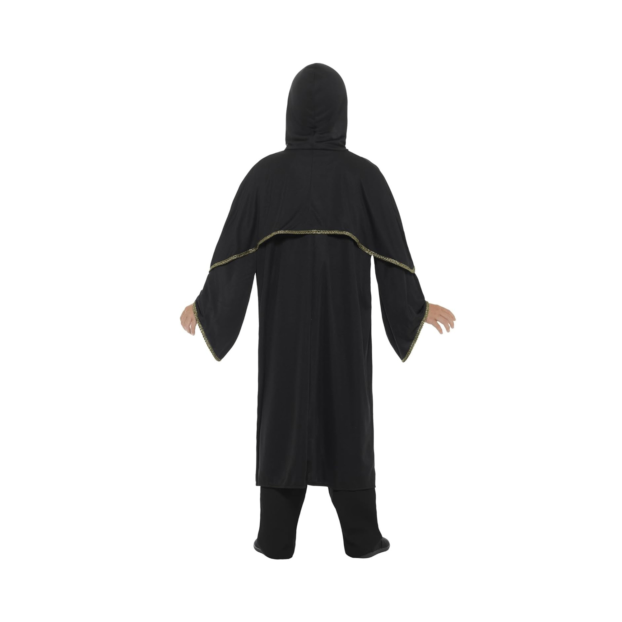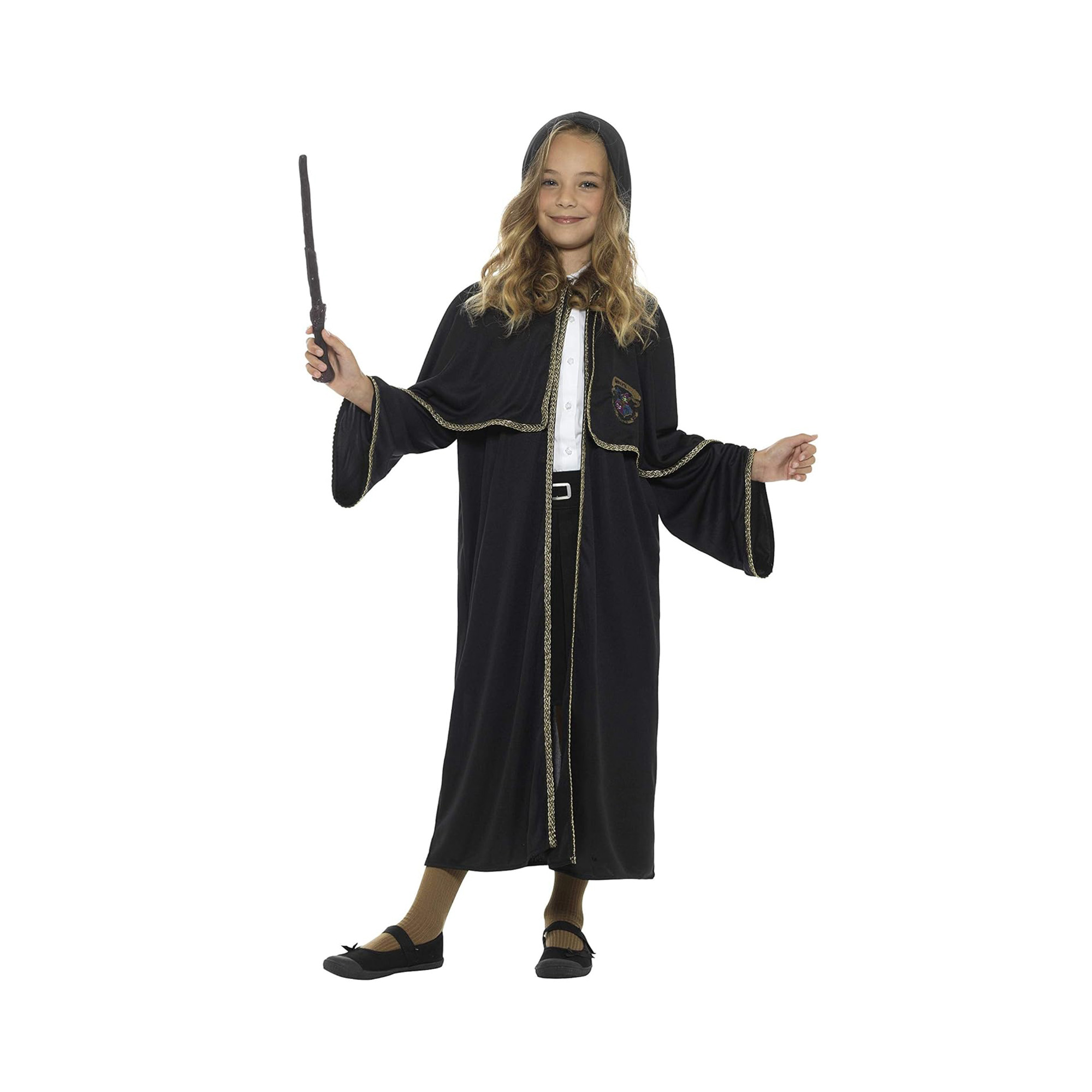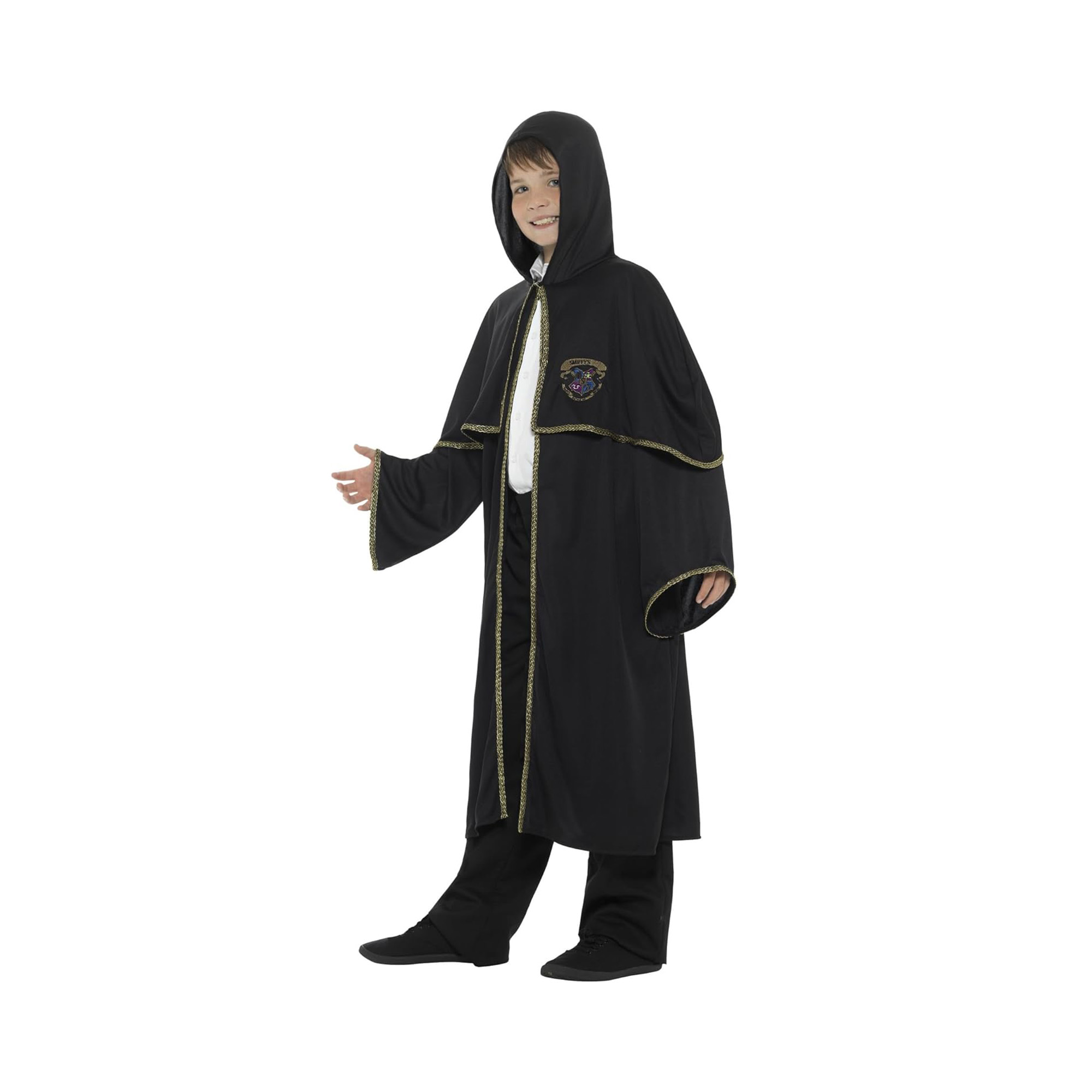 Černý plášť s kapucí promění dítě v nadaného studenta magie. Plášť zdobí zlaté lemování a výšivka s erbem kouzelnické školy (design výrobce Smiffy's). Tento čarodějnický plášť využijete na karnevaly, halloweenské párty nebo tematické oslavy. TIP: Pro autentický vzhled postavy čaroděje doplňte plášť o kouzelnou hůlku nebo špičatý klobouk. Velikost kostýmu: L-XL (11-13 let) Balení obsahuje: kvalitní černý plášť s kapucí, výšivkou erbu a zlatým lemováním