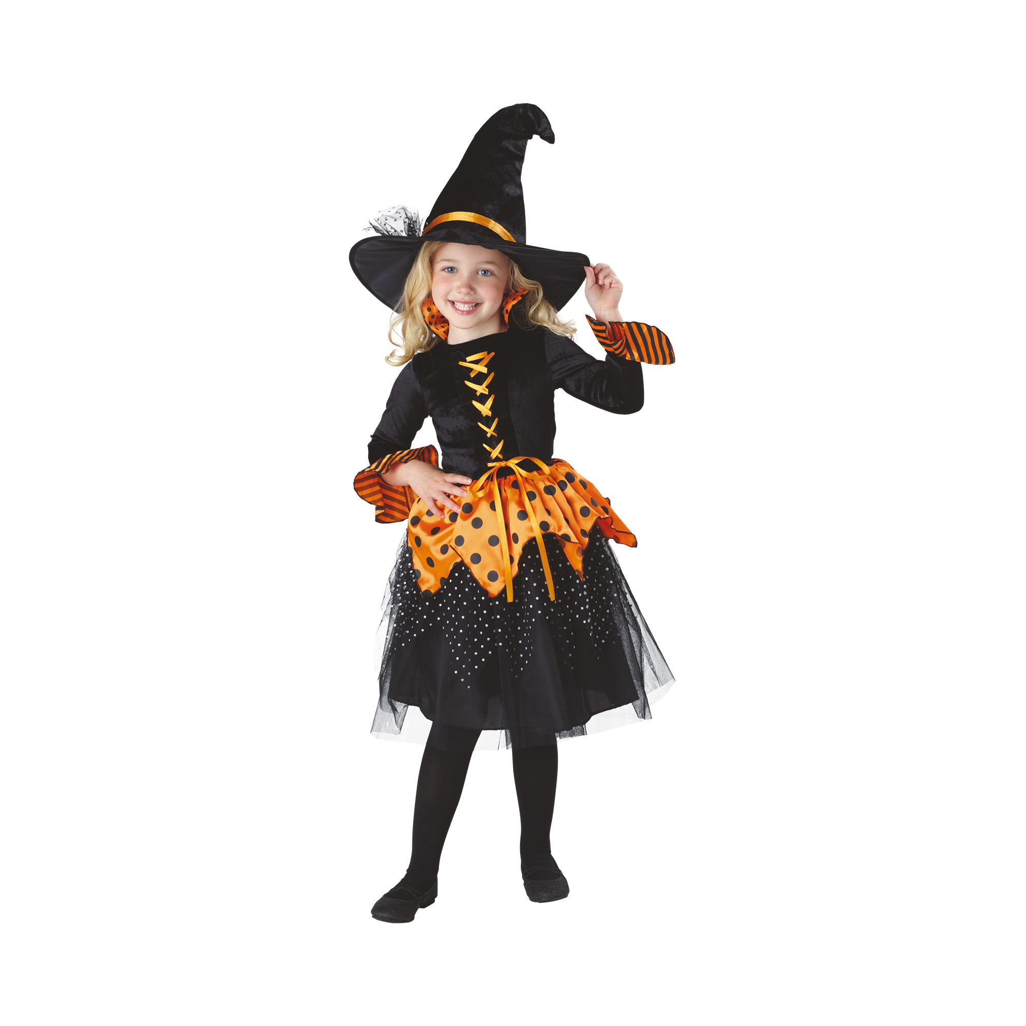 Dětský kostým Čarodějka oranžovo-černá je dostupný ve velikostech 3-4 roky, 4-6 let a 7-9 let. Perfektní volba na karneval, Halloween nebo pálení čarodějnic! Kostým je laděný do černé, oranžové a bílé barvy a zahrnuje černé šaty veselého, střapatého střihu. Ty jsou doplněné o zajímavé oranžové detaily v podobě stojáčku u krku, mašle v živůtku a volánových rukávů. Šaty mají potisk puntíků a proužků a zapínají se vzadu na suchý zip. Čarodějnický kostým doplňuje špičatý klobouk ozdobený mašlemi. Pro další dekorace a kostýmové doplňky v čarodějnickém motivu můžete prozkoumat naše sezónní kategorie Pálení čarodějnic nebo Halloween. Velikosti: 3-4 roky, 4-6 let a 7-9 let Materiál: 100% polyester Balení obsahuje: skládací klobouk a šaty Nevhodné pro děti do 3 let.