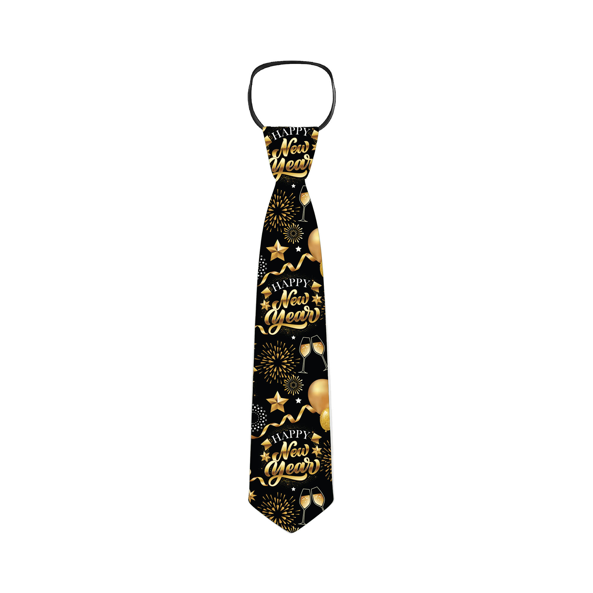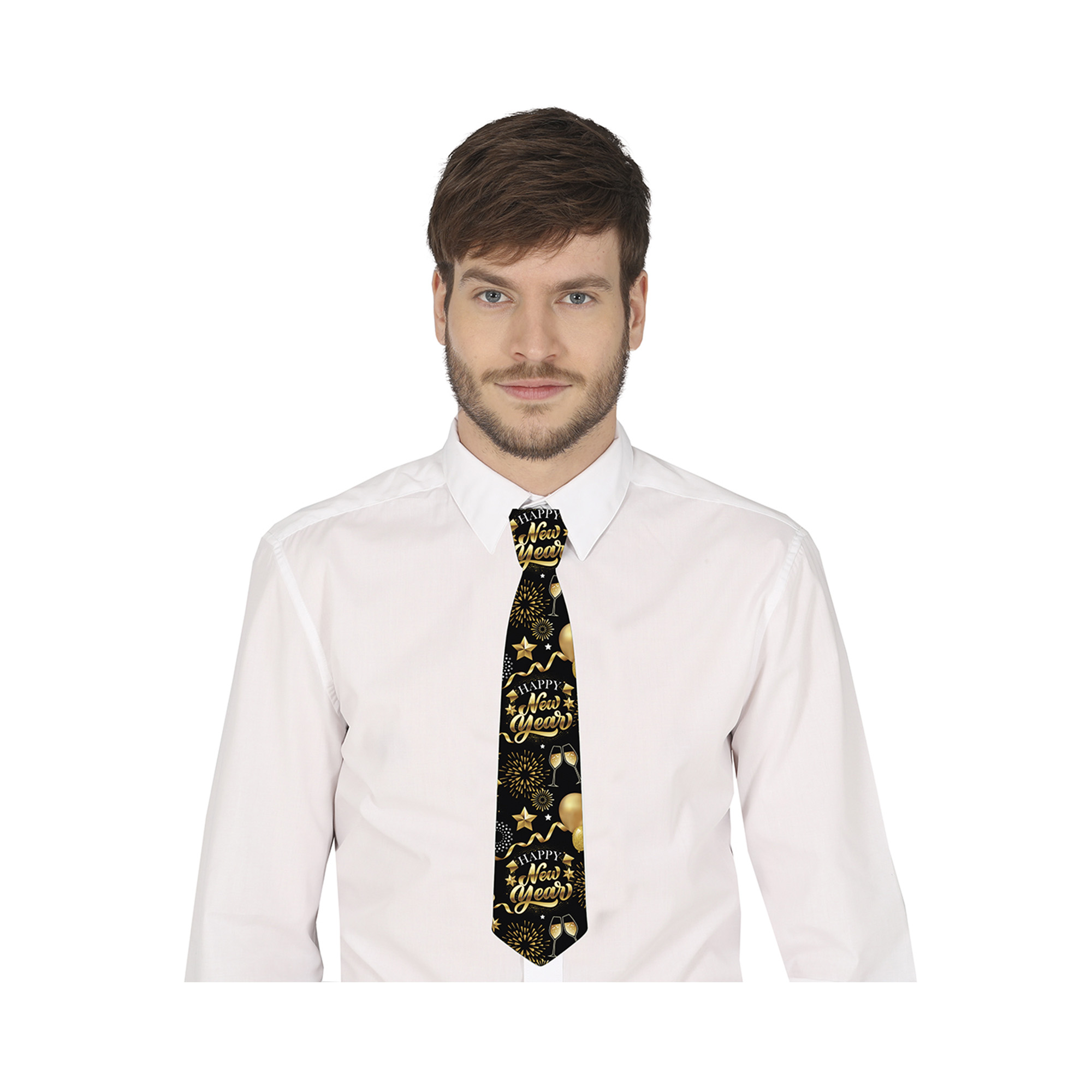 Elegantní černá kravata se zlatým potiskem nápisů Happy New Year je vhodná jako doplněk outfitu na silvestrovskou párty. Tuto silvestrovskou kravatu jednoduše nasadíte kolem krku pomocí zabudované gumičky. Pro další silvestrovské doplňky a dekorace můžete prozkoumat naši kategorii Vánoce a Silvestr. Materiál: polyester Rozměry: délka 45 cm Velikost: univerzální (určeno pro dospělé) Balení obsahuje: 1× párty kravatu na gumičku