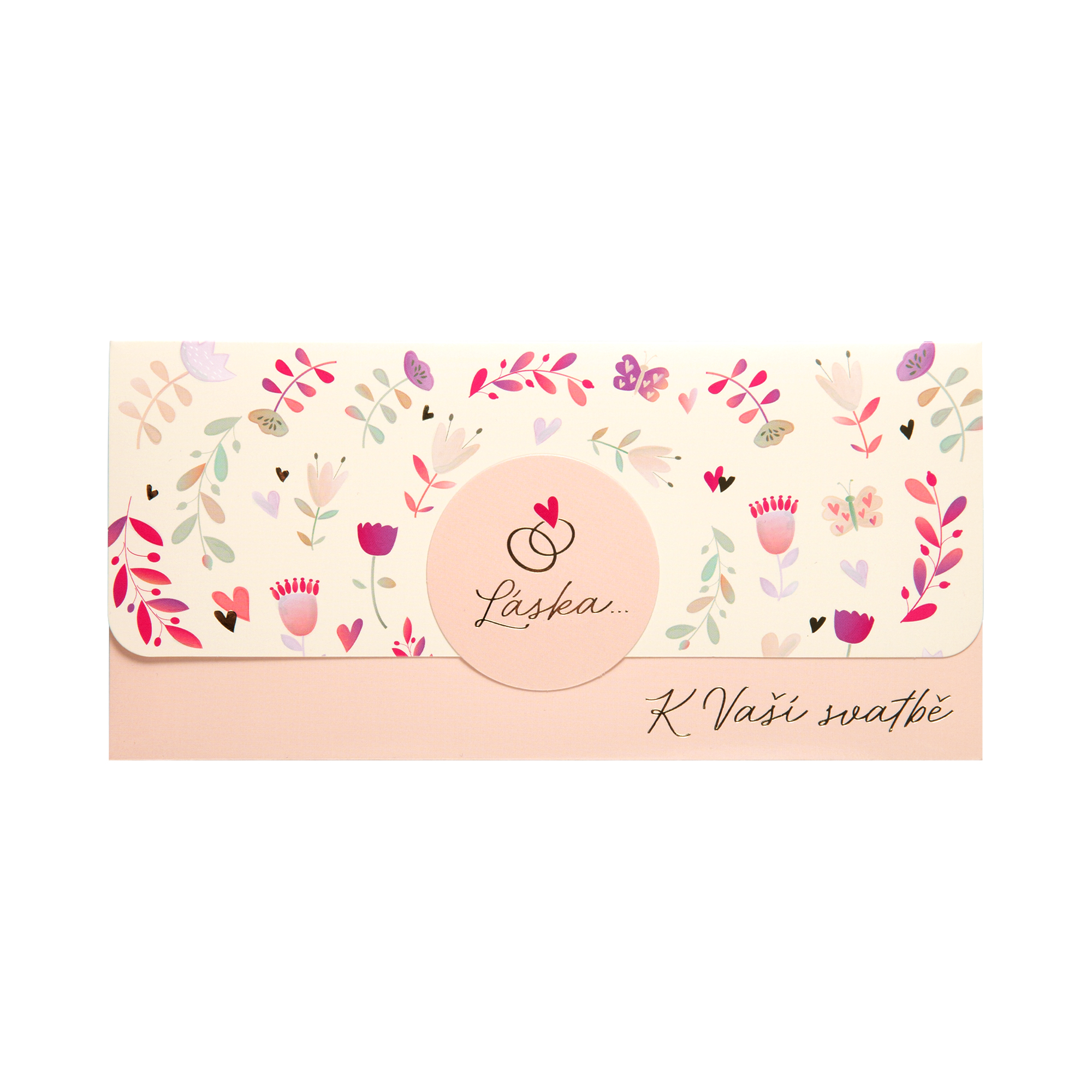 Něžná papírová magnetická obálka představuje snadný způsob, jak darovat peníze nebo voucher. Kombinace růžové barvy, zlaté ražby a motivů květin potěší nevěstu i ženicha. Na přední straně najdete krom textu K Vaší svatbě i motiv snubních prstenů s nápisem Láska. Vyměňte obyčejnou bílou obálku za veselý Money Gift a překvapte obdarované dárkovým poukazem nebo hotovostí, která bude v kapse díky zavírání na magnet v bezpečí. Text obálky: Láska… …je nejkrásnější ze všech divů světa. Ať Vás vždy v životě provází a nikdy Vám nic neschází! Rozměry: 8,8 × 18,8 cm