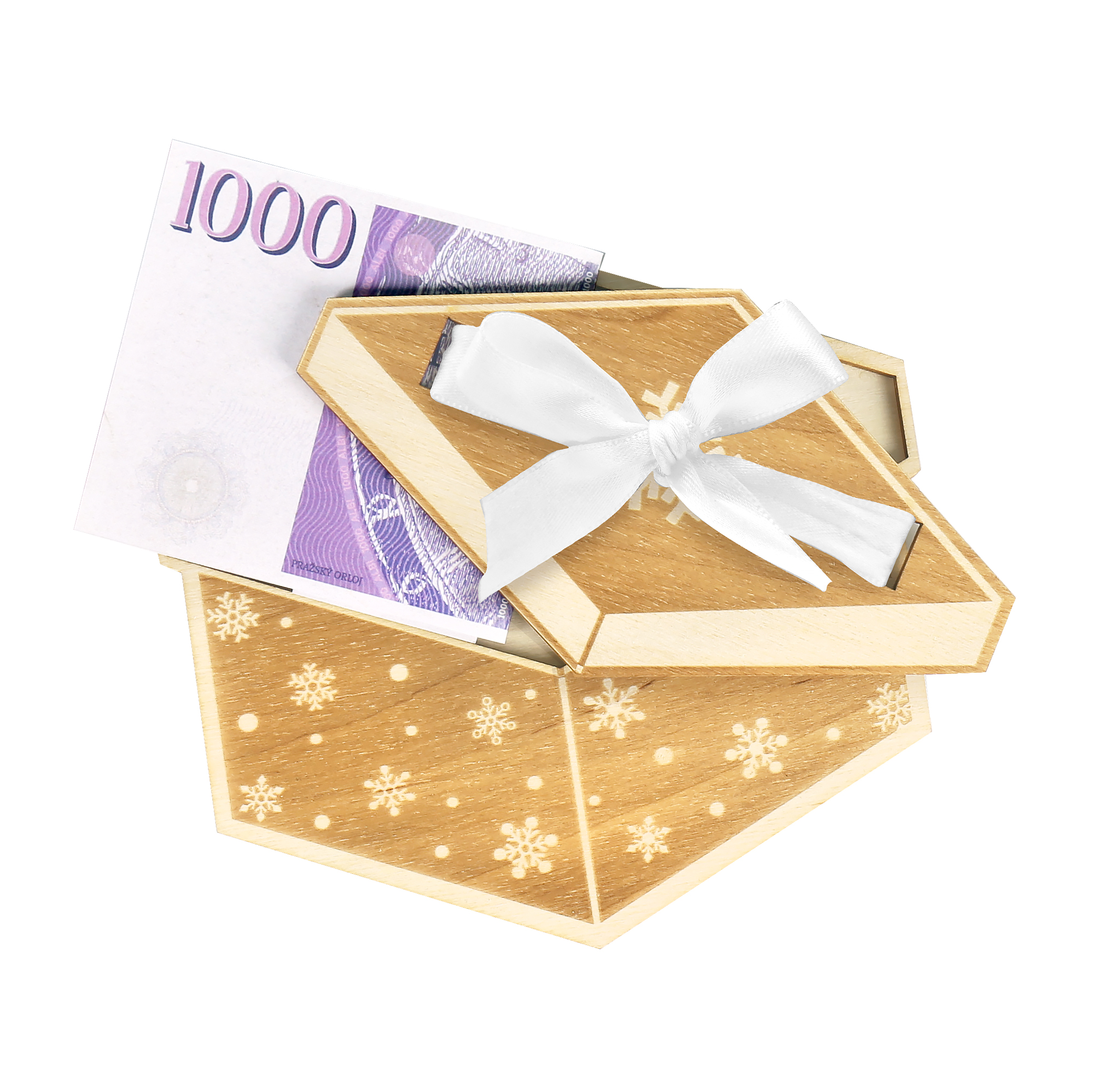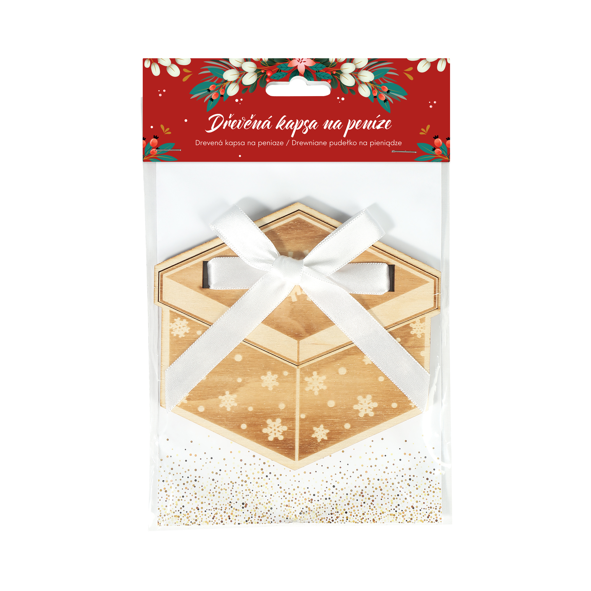 Chystáte se darovat peníze a přemýšlíte o originálním způsobu zabalení? Zvolte roztomilý dáreček s drobnými vločkami a s mašlí! Malá dárková kapsa na peníze ze dřeva umožňuje darovat bankovky či dárkové poukazy originálním způsobem, který potěší rodinu i přátele. Rozměry: cca 13,2 cm × 18 cm × 0,6 cm Dřevěné kapsy na peníze jsou vyráběny ručně v České republice.