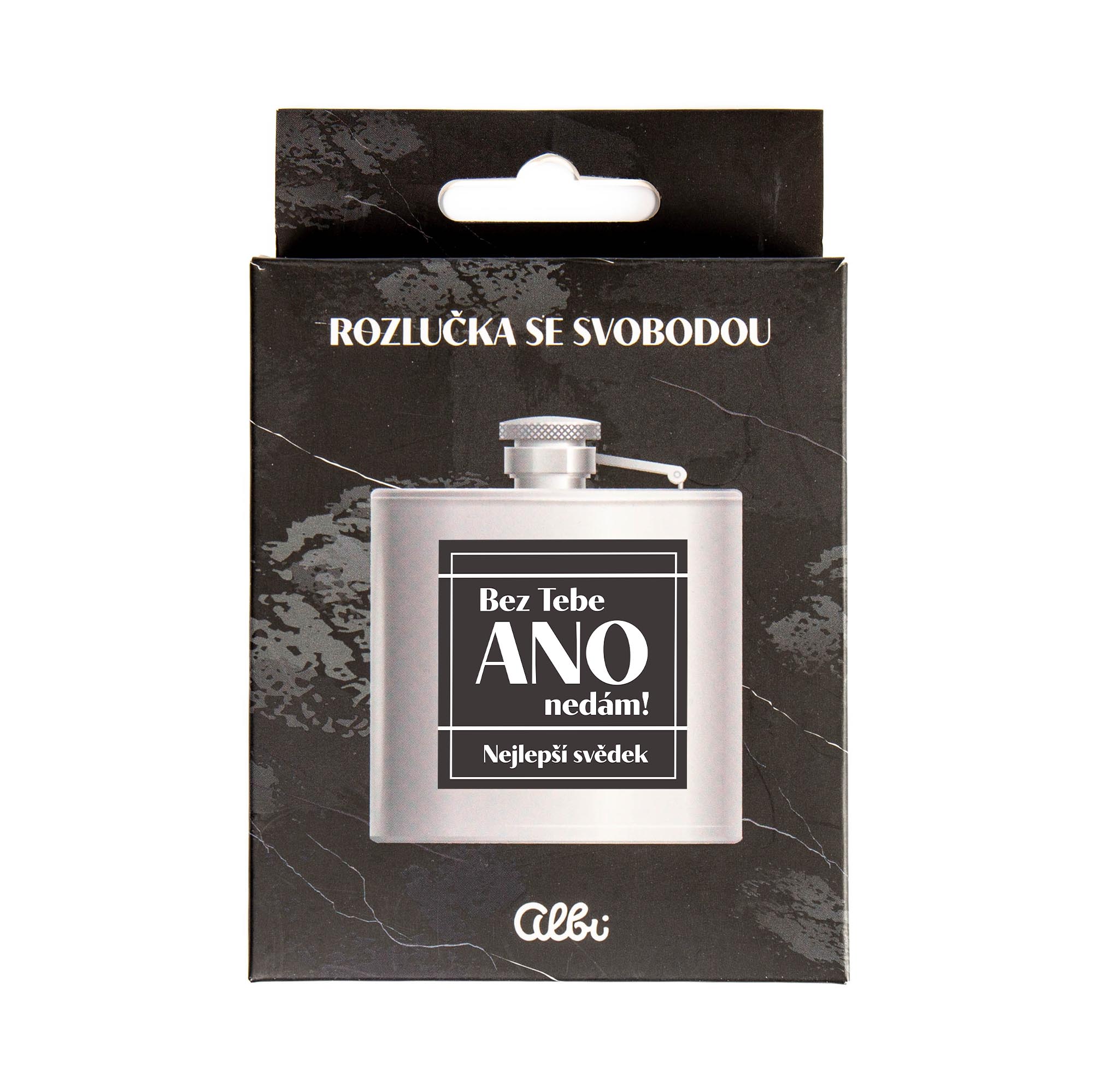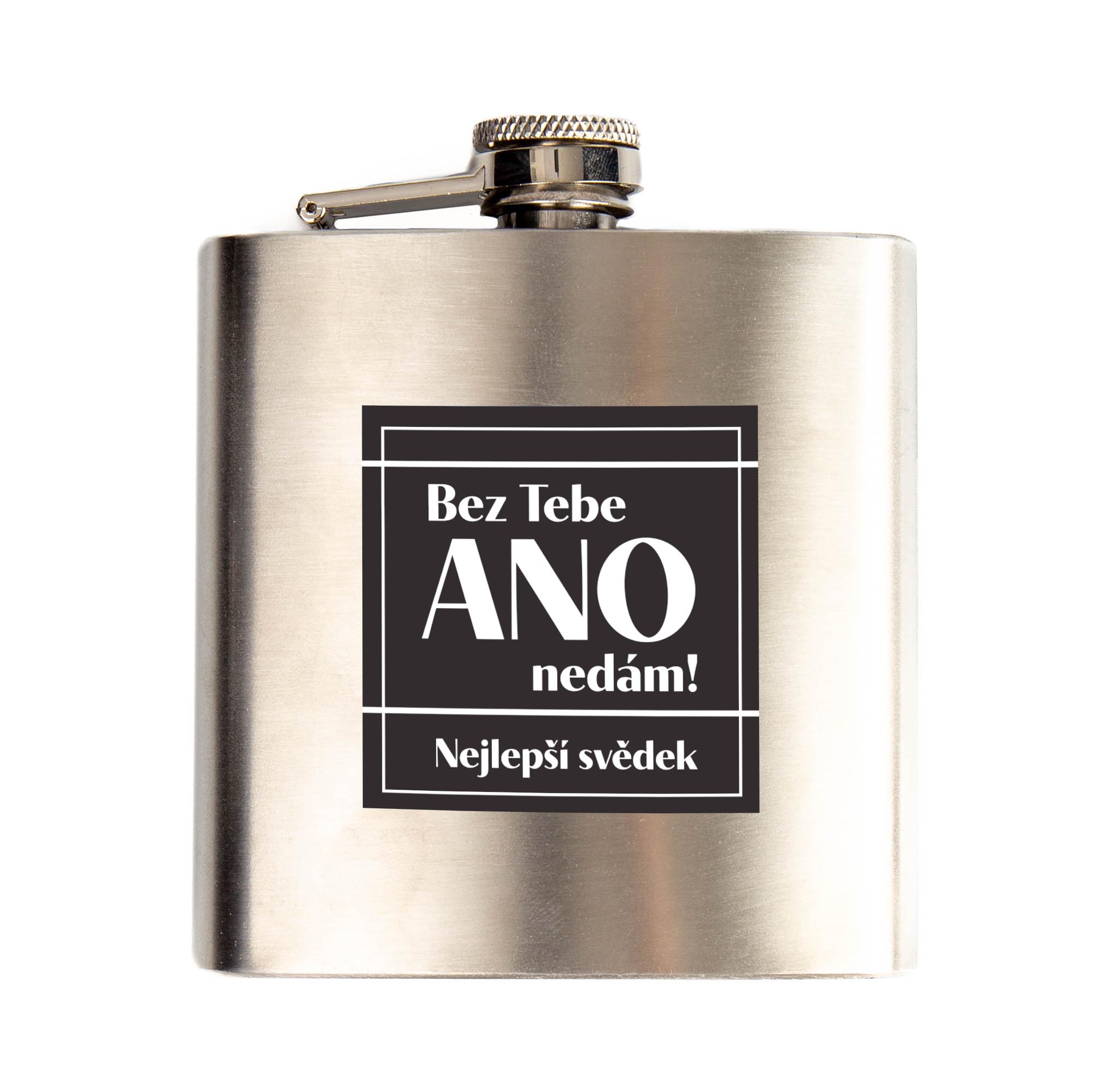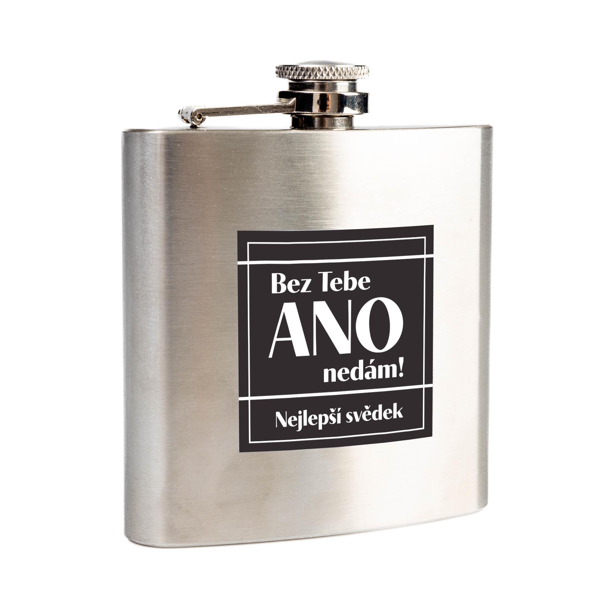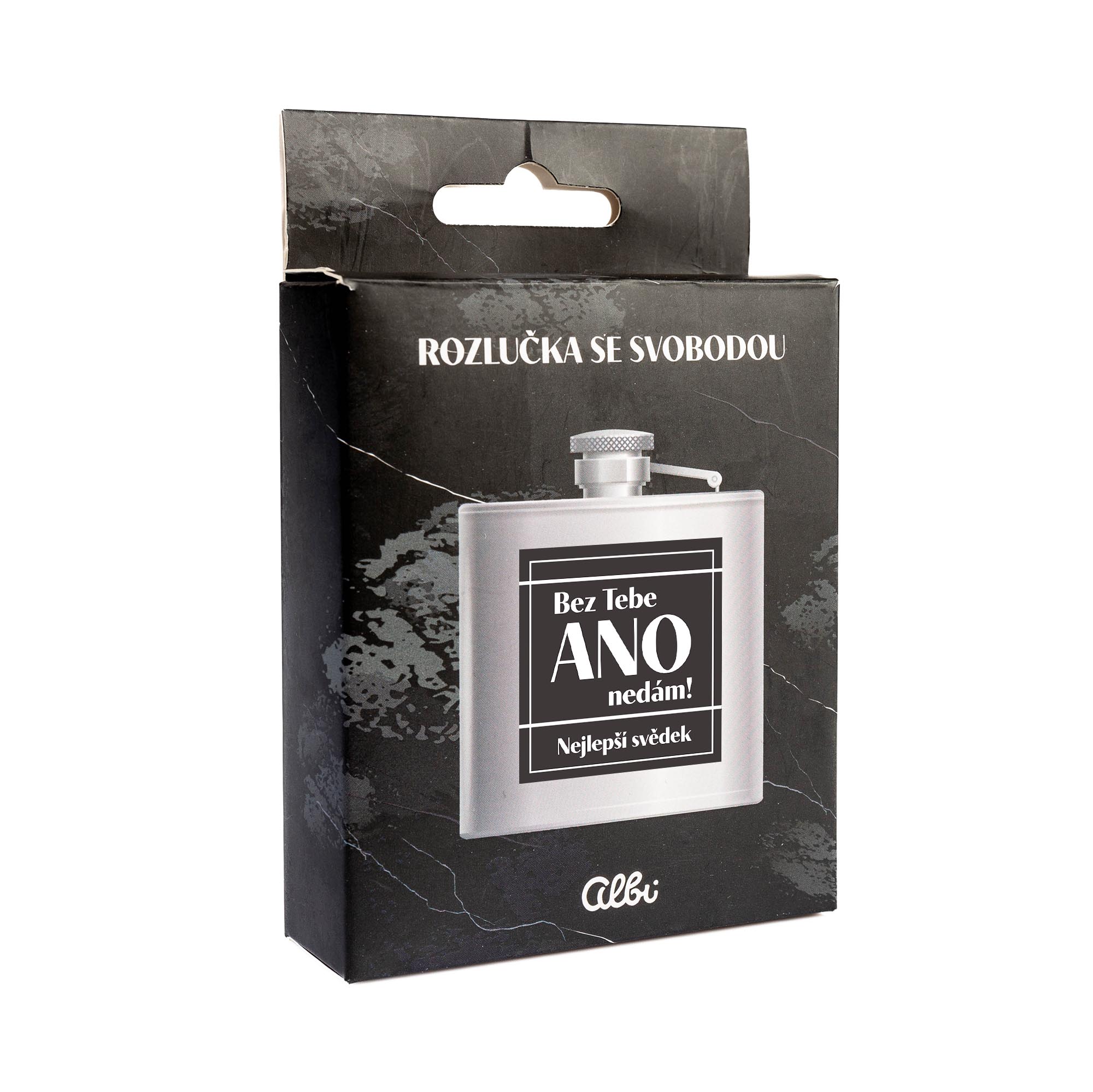 Chcete kamaráda překvapit velkou zprávou o své svatbě? Věnujte mu vtipnou placatku a rovnou ho požádejte, aby vám šel za svědka. Placatka s motivem "Bez tebe ANO nedám" je zabalena v papírové krabičce a bude tak pěkným dárkem pro svědka. Objem: 175 ml Rozměry balení: 9,5 cm × 11,5 cm × 2,5 cm