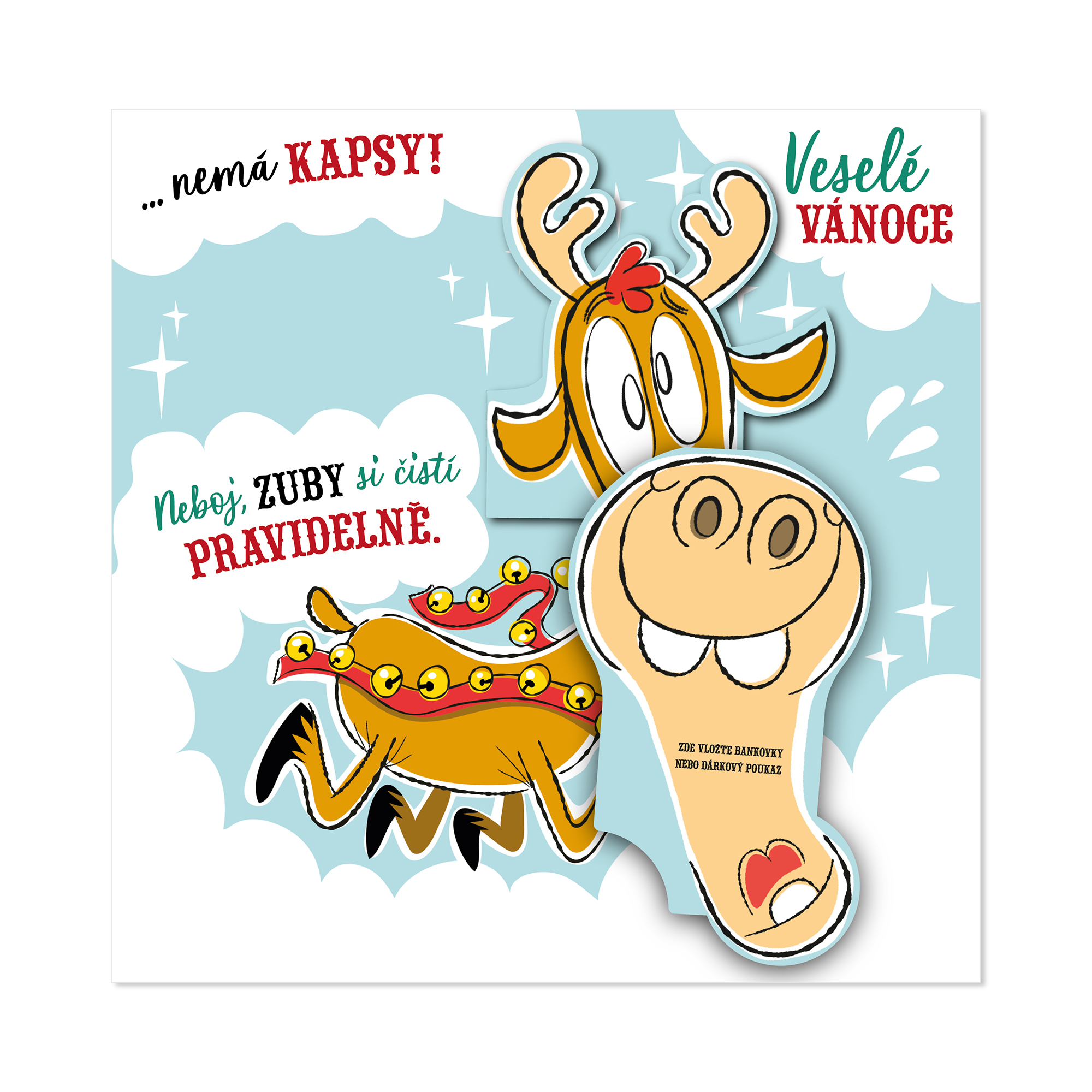Pop-up obálka na peníze s vtipným textem a legračním sobem, který vykukuje na přední stranu skrze vyřízlé okénko. Celé přání je bláznivě pojaté, proto potěší především děti. Po otevření z kapsy na peníze "vystoupí" 3D sob, který zároveň vysune čumák mimo přáníčko. Mezi jeho zuby můžete vložit finanční obnos či dárkový poukaz. Ten tam bude držet díky vycvakávacím drážkám. Text přání: Vánoční sob Ti na očích přesně vidí co si nejvíce přeješ! Ale bohužel…nemá kapsy! Neboj, zuby si čistí pravidelně. Veselé Vánoce. Součástí balení je i bílá obálka. Rozměry: 10 × 20 cm