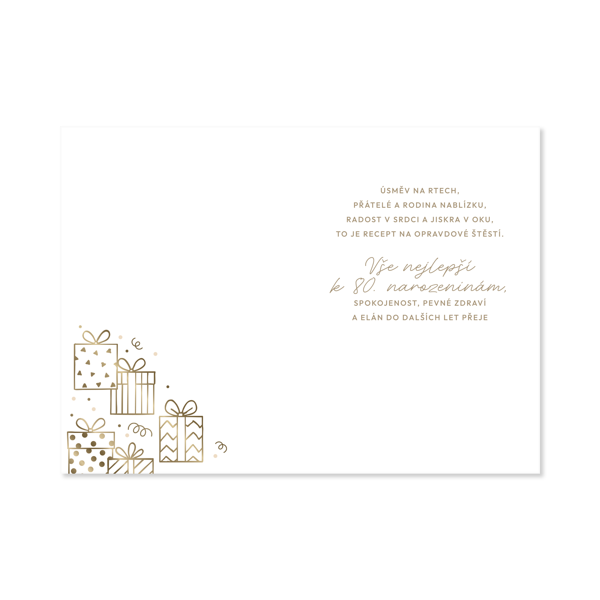 Jubilejní narozeninové přání s věnováním uvnitř. Velkou číslici 80 doplňuje motiv dárků – vše ve zlaté ražbě na bílém podkladu. Uvnitř najdete věnování: "Úsměv na rtech, přátelé a rodina nablízku, radost v srdci a jiskra v oku, to je recept na opravdové štěstí. Vše nejlepší k 80. narozeninám, spokojenost, pevné zdraví a elén do dalších let přeje (…)". Pod textem pak zůstává dostatek místa pro váš podpis, případně vlastní vzkaz. Součástí přání je i bílá papírová obálka. Tip na dárek ke kulatým narozeninám. Rozměry přání: 19,5 × 13,5 cm