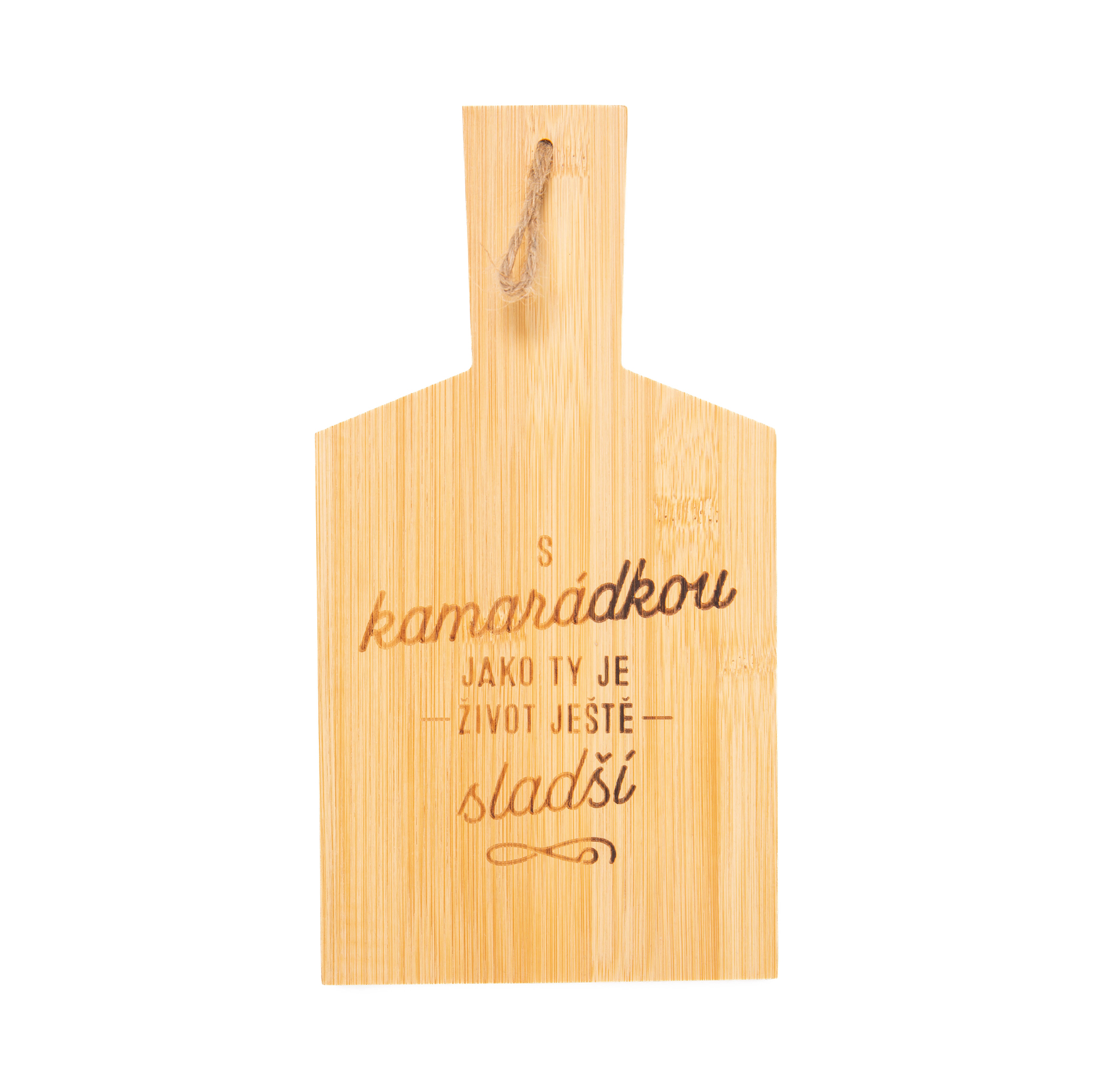 Prkénko z bambusového dřeva je skvělým pomocníkem v kuchyni a zároveň splňuje zásady udržditelnosti. Milé texty na prkénku svého majitele potěší při každém použití. Rozměry: 14 cm × 26,5 cm × 1 cm