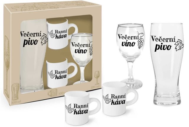 V Rodinné sadě z kolekce Můj bar si každý najde to své. V sadě naleznete 2 hrnky na ranní kávu, bez které se jen těžko funguje. Dále pak elegantní sklenici na víno a pivní půllitr na příjemné večerní posezení s vaším oblíbeným nápojem. Sada je v krásném balení, takže si nemusíte lámat hlavu s tím, jak dárek zabalit, a můžete ho darovat klidně jen tak. Objem hrnků: 100 ml Objem vinné sklenice: 220 ml Objem půllitru: 500 ml