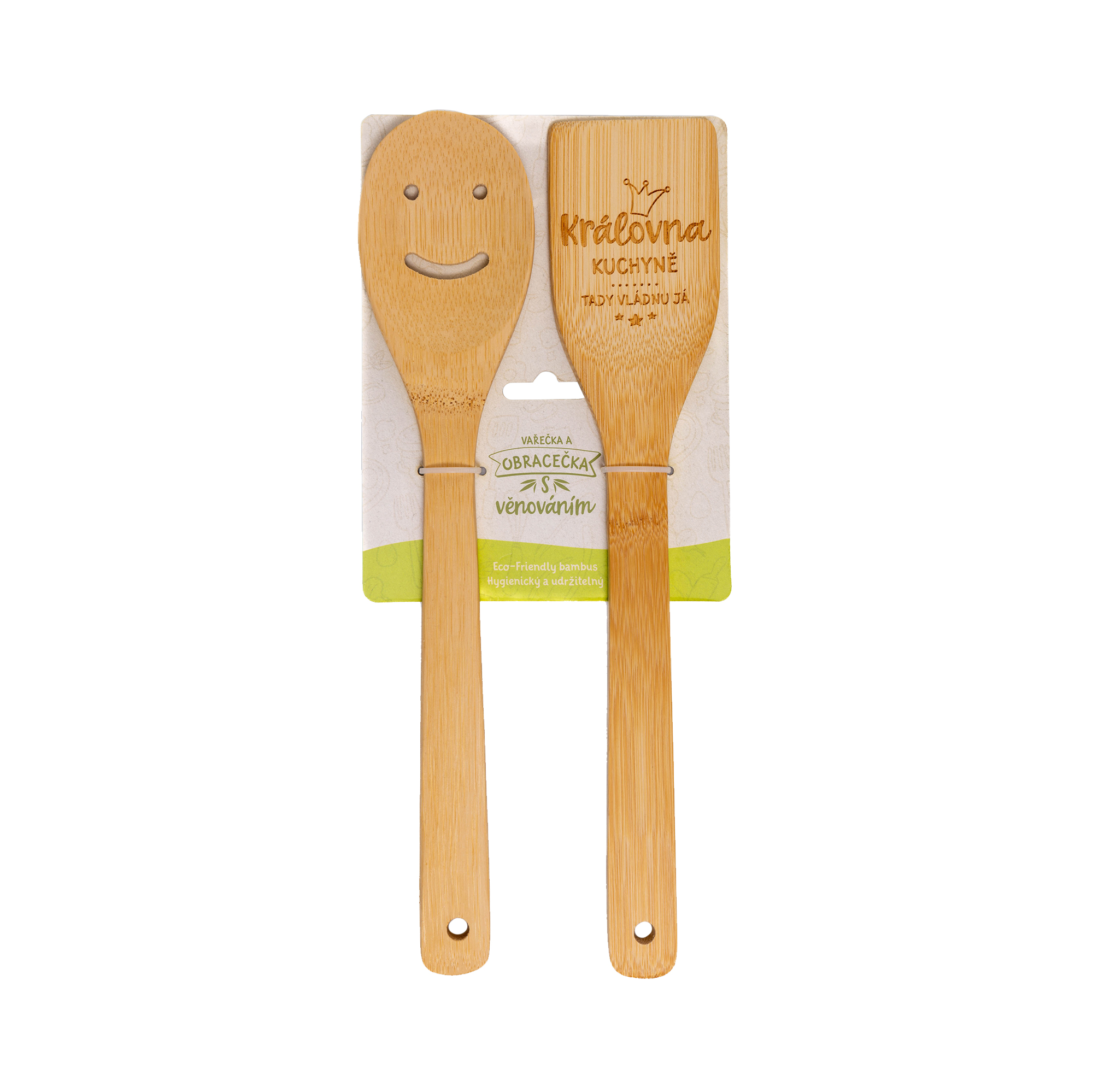 Udělejte radost nejen přírodě, ale také svým blízkým s milým a praktickým dárkem. Sada vařeček s věnováním je eko-friendly a udržitelné kuchyňské náčiní z bambusového dřeva. V sadě naleznete vařečku s roztomilým smajlíkem a obracečku s věnováním.  Rozměry balení: 13 cm × 30 cm
