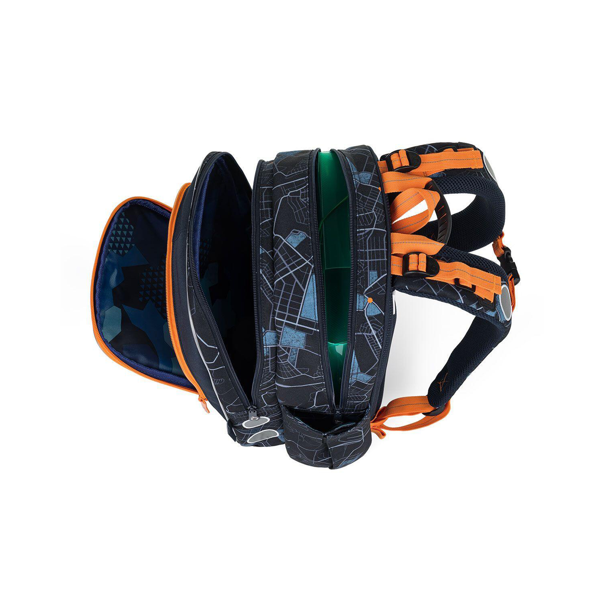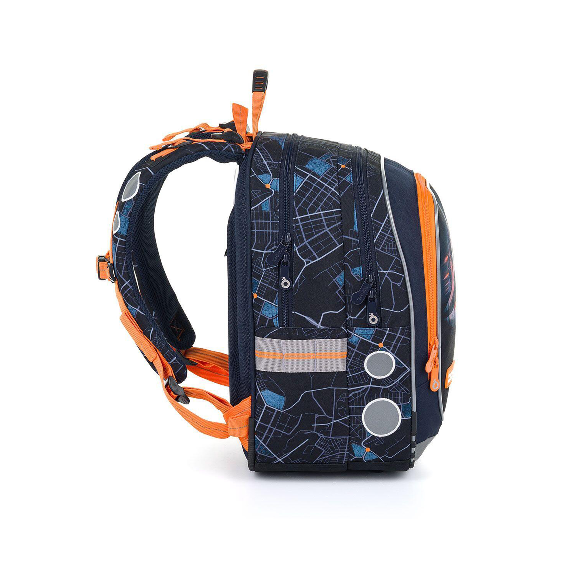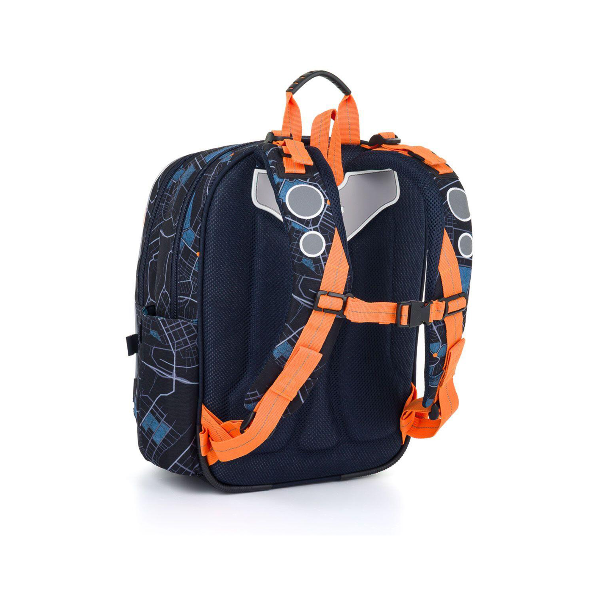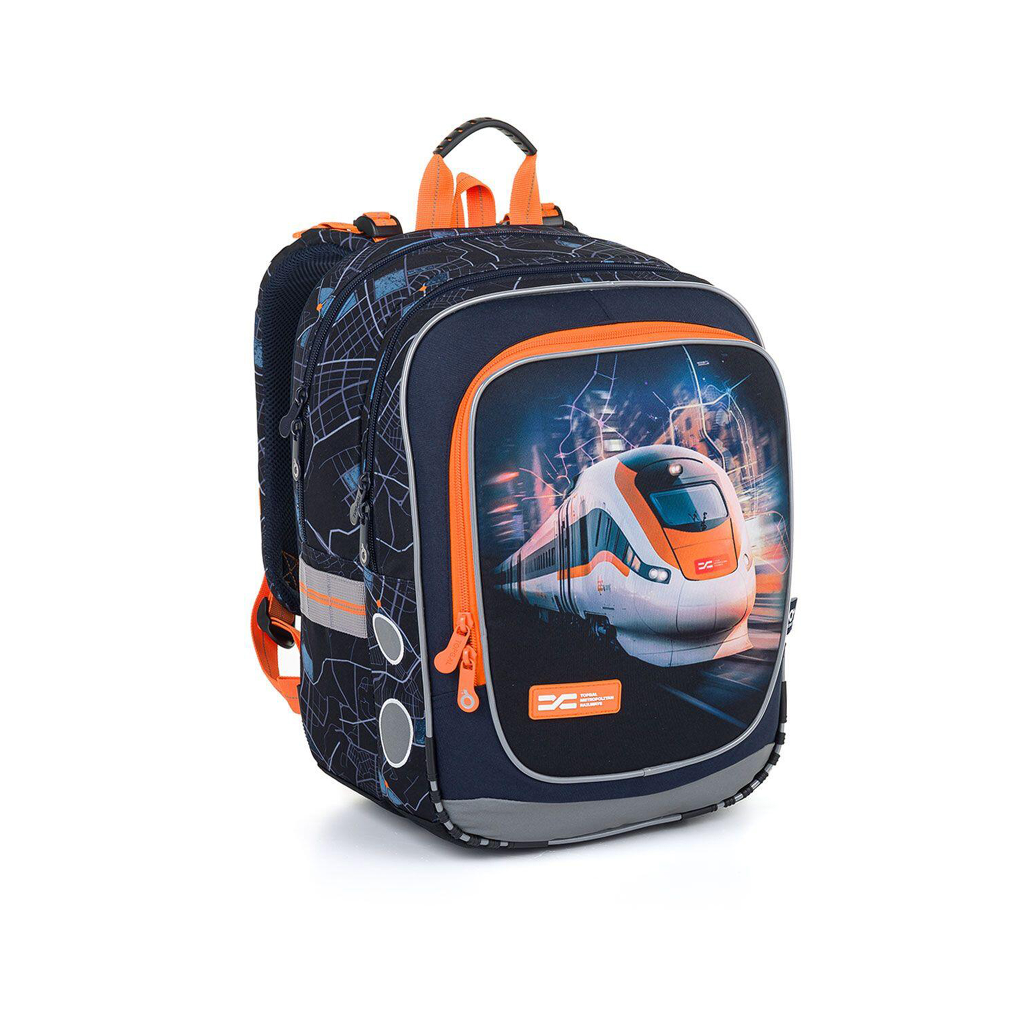 Lehký školní batoh ENDY je ideální volbou pro malé chlapce od 1. do 3. třídy ZŠ s výškou od 110 cm. Aktovku zdobí výrazný motiv vlaku, který zaujme na první pohled. Vnitřek je laděn do modro-černého provedení a celkový vzhled doplňují oranžové detaily, jež dodávají batohu energický a moderní nádech. Batoh váží pouhých 0,9 kg, takže nezatěžuje záda. Má 2 hlavní prostorné komory – zadní je ideální na učebnice a sešity, druhá, která je o něco menší, schovává jmenovku a síťovou kapsu na zip. Do hluboké přední kapsy se bez problémů vejde školní penál, případně krabička na svačinu či jiné drobnosti. Najdete v ní i odnímatelnou karabinu na klíče, takže už žádné zdlouhavé hledání. Do bočních kapes pak snadno uložíte láhev o objemu 0,5 l. Pro pohodlí a zdravé nošení je batoh osazen pevnými lisovanými zády, nastavitelnými ramenními popruhy a výškově nastavitelnou hrudní přezkou. Ramenní popruhy mají navíc magnetky, které udrží jejich volné konce na místě. Nechybí ani 2 poutka pro zavěšení na lavici a pohodlné přenášení v ruce. Bezpečnost dětí zajišťují reflexní prvky na bocích, čele i popruzích. Spodní část batohu chrání pevné, nepropustné dno s nožičkami, které zvyšuje odolnost v každodenním používání. Školní aktovka je vyrobena z recyklovaného materiálu rPET českou firmou, má zátěr proti dešti a byla testována v ITC Zlín, takže splňuje náročné požadavky na kvalitu a ergonomii. Tento školní batoh je stylový, lehký, bezpečný a praktický společník pro každého malého školáka. Parametry produktu Hmotnost: 0,9 kg Rozměry: 28 × 39 × 19 cm Objem: 21 litrů Nosnost: 7 kg Materiál: 100% polyester