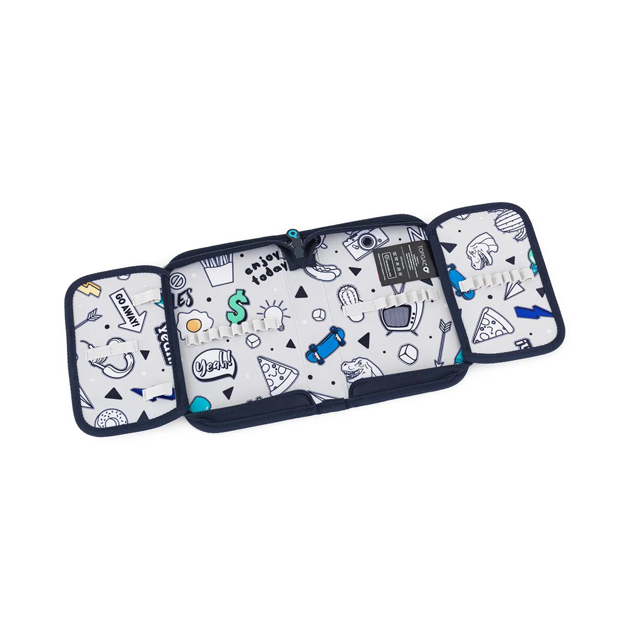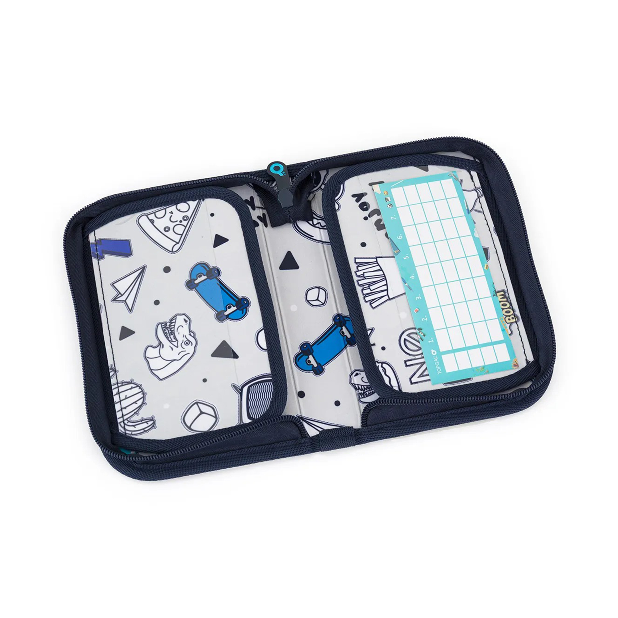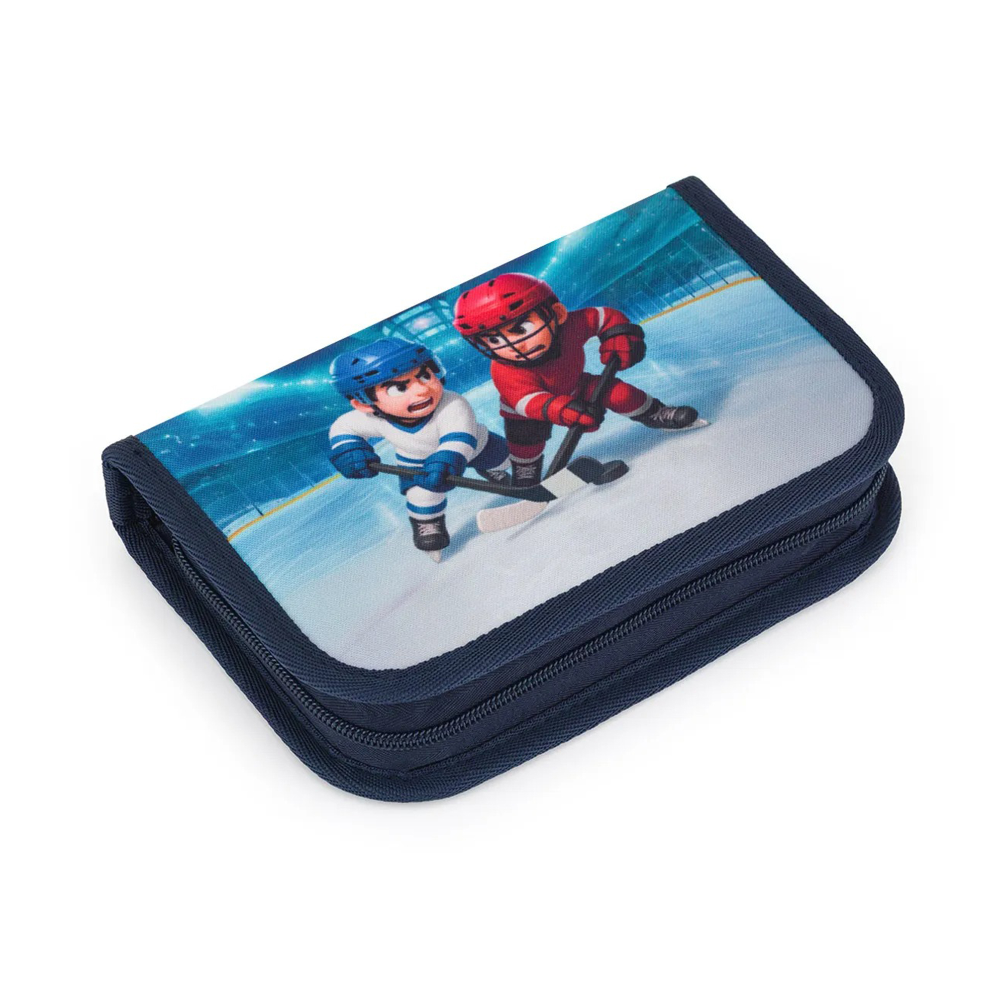 Stylový jednopatrový penál s motivem 2 hokejistů potěší všechny kluky a sportovní nadšence, kteří chtějí mít přehled ve svých školních potřebách a zároveň milují kreativitu. Uvnitř se totiž nachází šedá podšívka s obrázky k vybarvení. Penál do školy má 2 klopy a gumové úchyty pro 21 pastelek, tužek či fixů plus 3 širší místa na pravítko, kružítko nebo nůžky a 2 větší úchyty na gumu a ořezávátko. Pod průhlednou folií najdete rozvrh hodin, druhá kapsa na klopě může posloužit jako úložiště na poznámky. Polstrování chrání všechny potřeby, zipy s velkými taháčky usnadňují dětem manipulaci. Topgal penál není vhodný do pračky. Parametry produktu Hmotnost: 200 g Rozměry: 21 × 5 × 14 cm Materiál: 100% polyester
