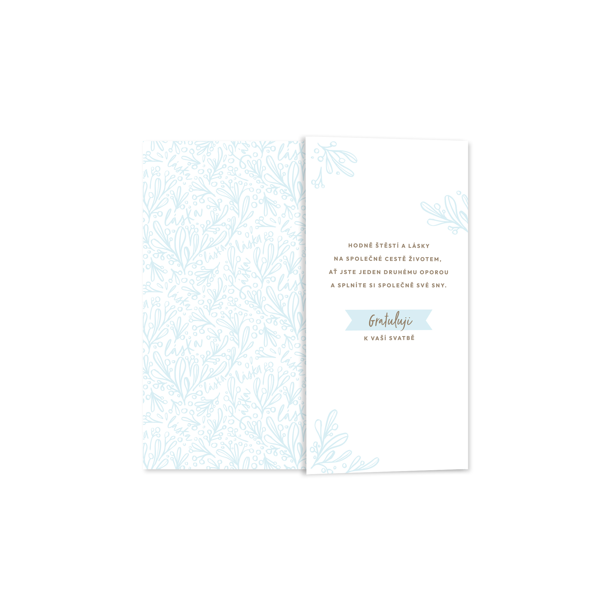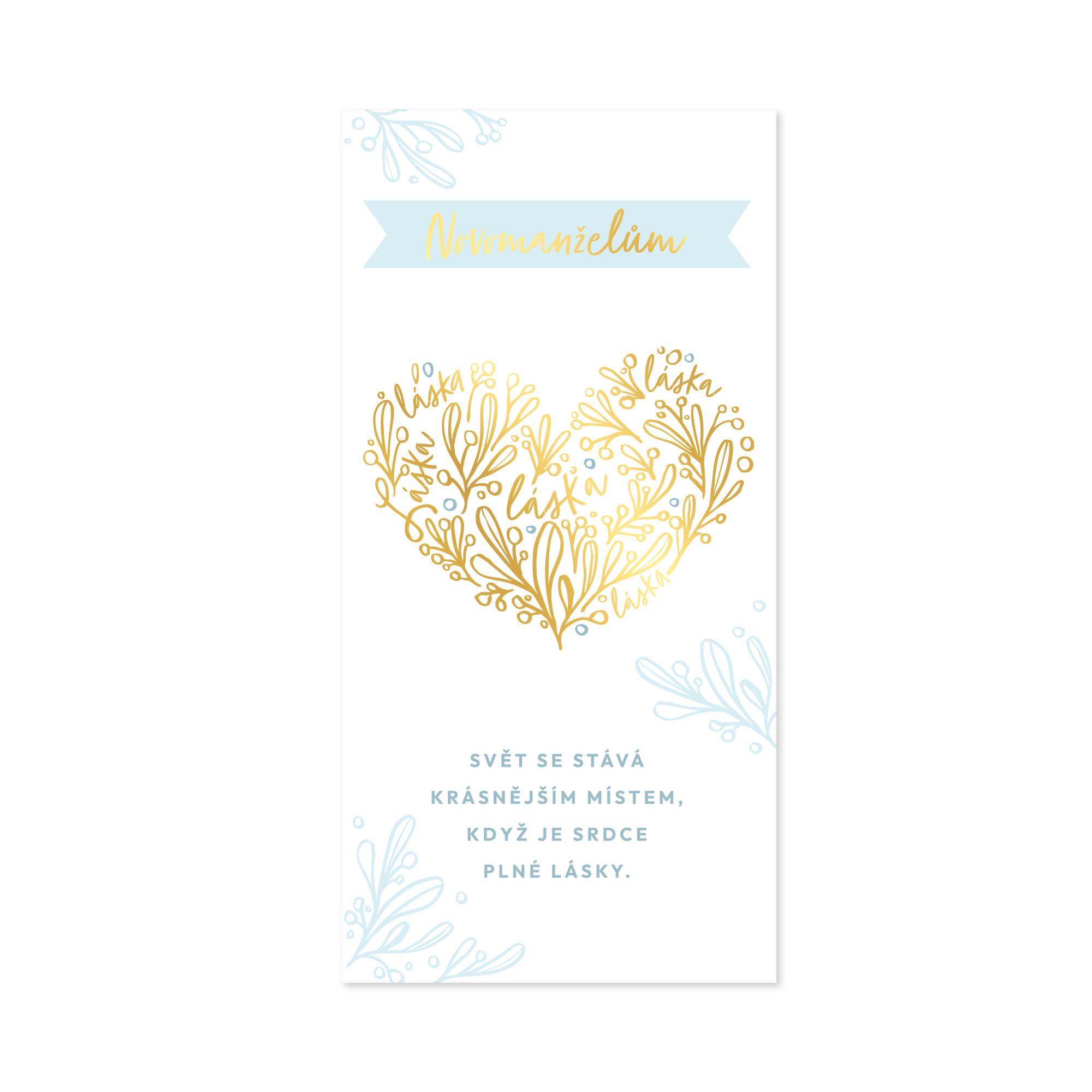 Odklápěcí papírová obálka na peníze s motivem srdíčka ve zlaté ražbě a jemných modrých květů. Snadný a elegantní způsob darování peněz pro novomanžele – stačí odklopit dvě horní části přání a hotovost či dárkový poukaz vložit dovnitř. Uvnitř kapsy je věnování a zároveň dostatek místa pro Váš podpis či vzkaz. Text uvnitř: Novomanželům. Svět se stává krásnějším místem, když je srdce plné lásky. Hodně štěstí a lásky na společné cestě životem, ať jste jeden druhému oporou a splníte si společně své sny. Gratuluji k Vaší svatbě Součástí balení je i bílá obálka. Rozměry: 10 × 20 cm