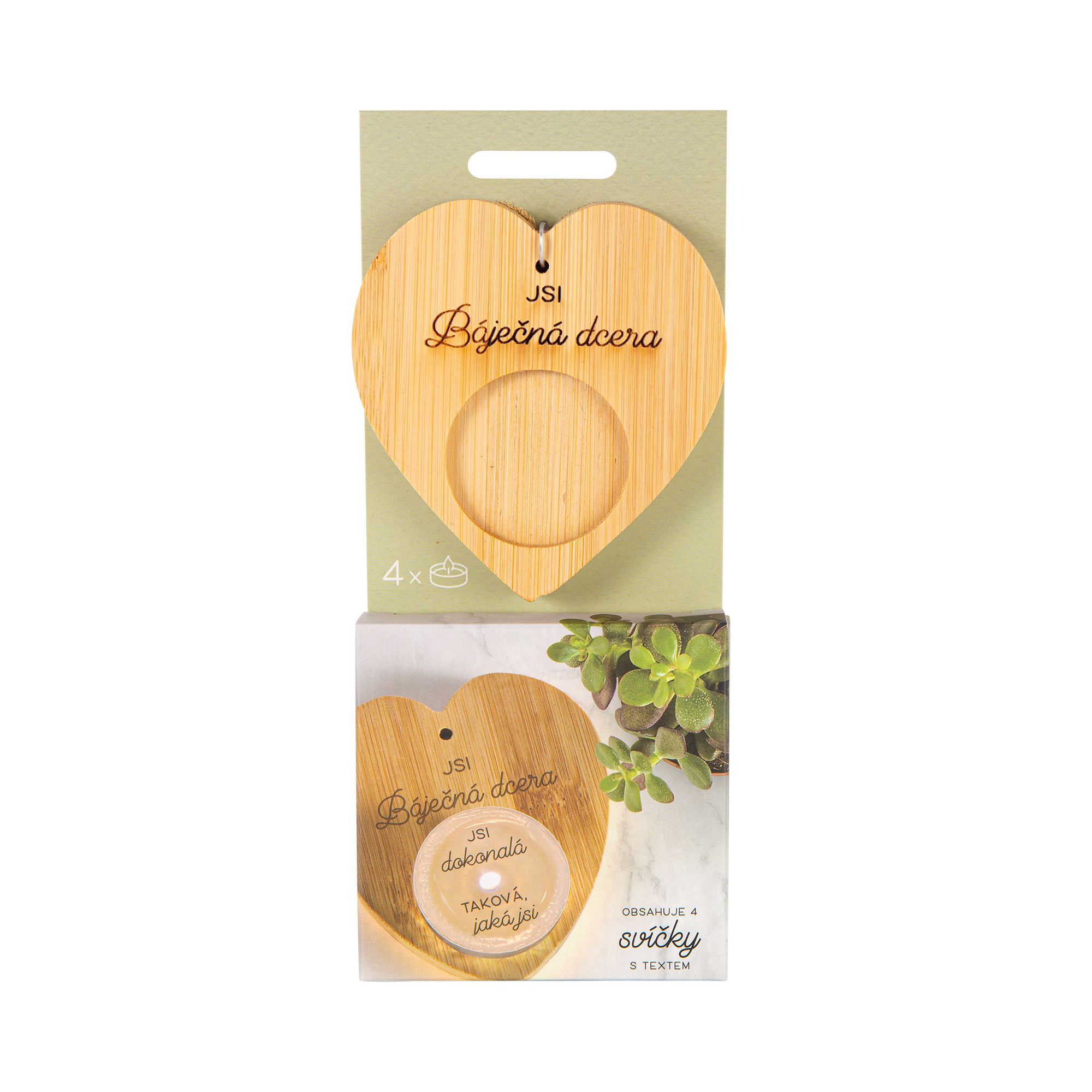 Dárkové balení svícnu s věnováním a 4 svíček s milým textem, který se magicky objeví až po rozehřátí vosku. Umístěte svíčku do bambusového svícnu s věnováním a vychutnejte si moment, kdy se ve světle plápolajícího plamene odhalí tajemství skryté pod vrstvou rozehřátého vosku. Balení obsahuje bambusový svícen a 4 čajové svíčky s různými vzkazy. Svíčky s překvapením jsou vhodné jako dárek pro maminku, babičku nebo pro paní učitelku. Můžete je věnovat k narozeninám, k Vánocům nebo jen tak pro štěstí.
