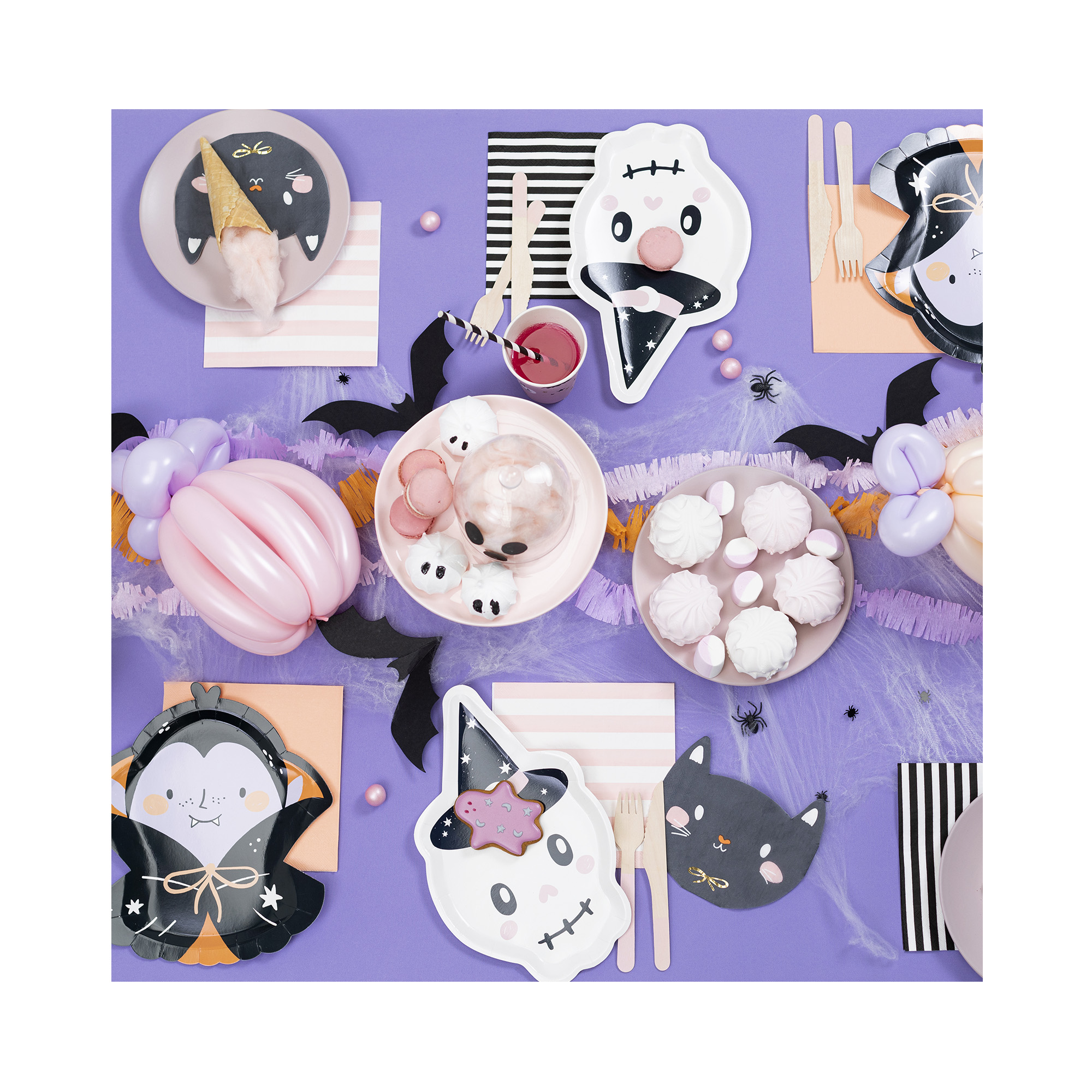 Sada šesti papírových talířů ve tvaru lebky se špičatým kloboukem je skvělou volbou, jak stolování na tematické oslavě vyřešit stylově a prakticky. Talíře jsou v bílé, černé a růžové barvě a využijete je při oslavě pálení čarodějnic nebo o Halloweenu. Pro další dekorace a kostýmové doplňky ve strašidelném motivu můžete prozkoumat naše kategorie Pálení čarodějnic nebo Halloween. Rozměry: 18 × 27 cm Balení obsahuje: 6 ks papírových talířů