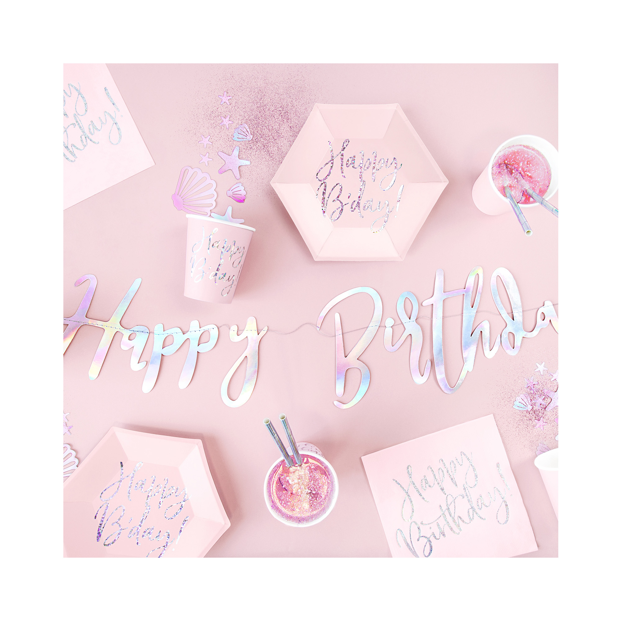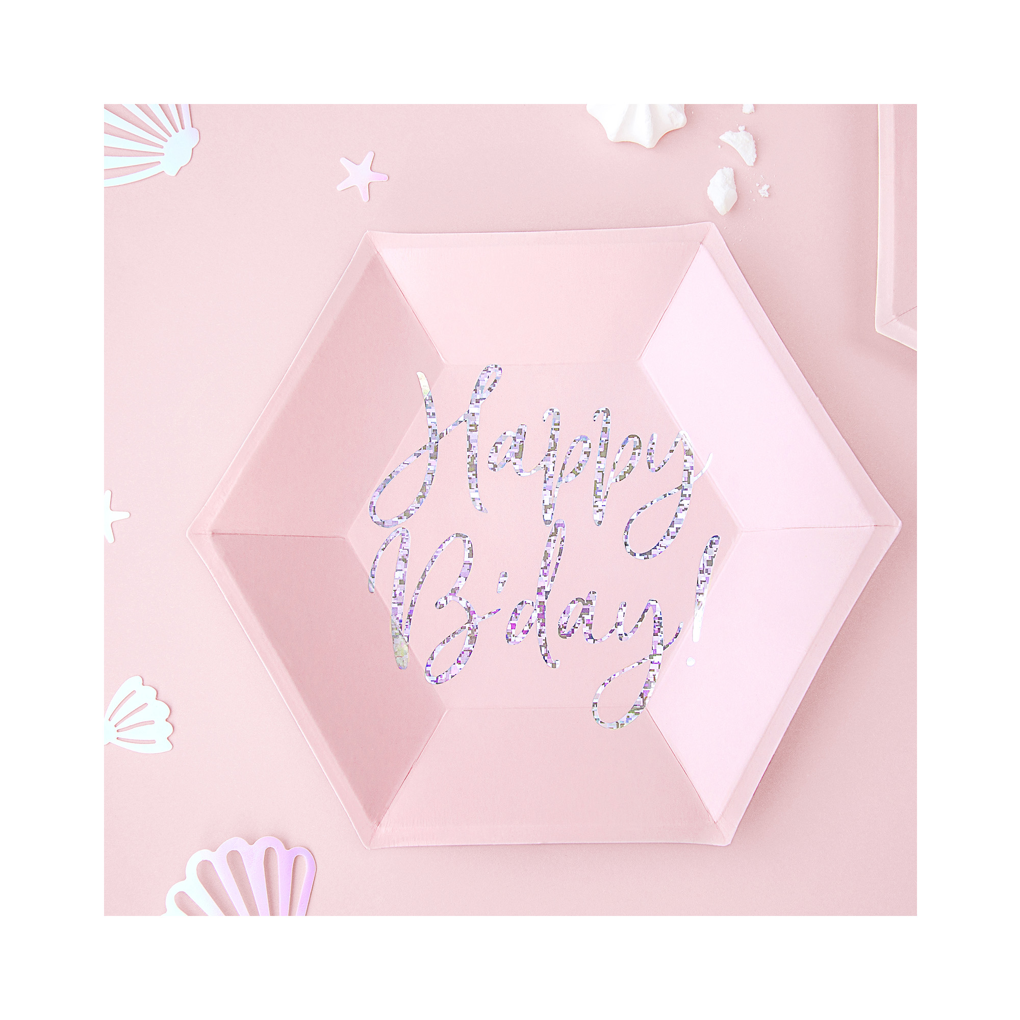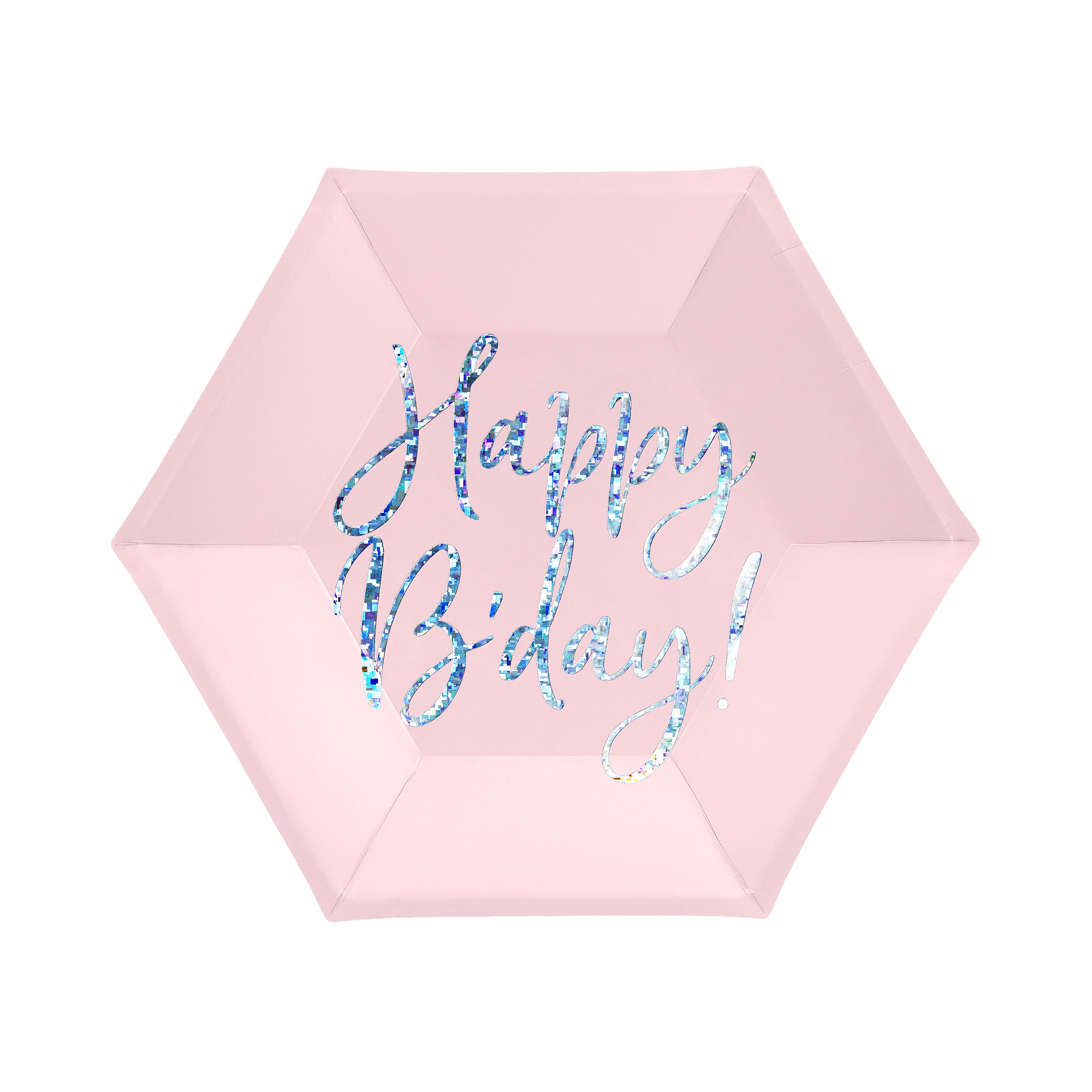 Sada šesti papírových talířů s holografickým potiskem nápisu Happy B'day! je skvělá volba, jak stolování na narozeninové oslavě vyřešit stylově a prakticky. Šestihranné talíře ve světle růžové barvě lze snadno sladit s dalšími produkty z kolekce Happy B'day! nebo s párty dekoracemi a doplňky ve stejném odstínu. Průměr: 20 cm Balení obsahuje: 6 ks laminovaných papírových talířů