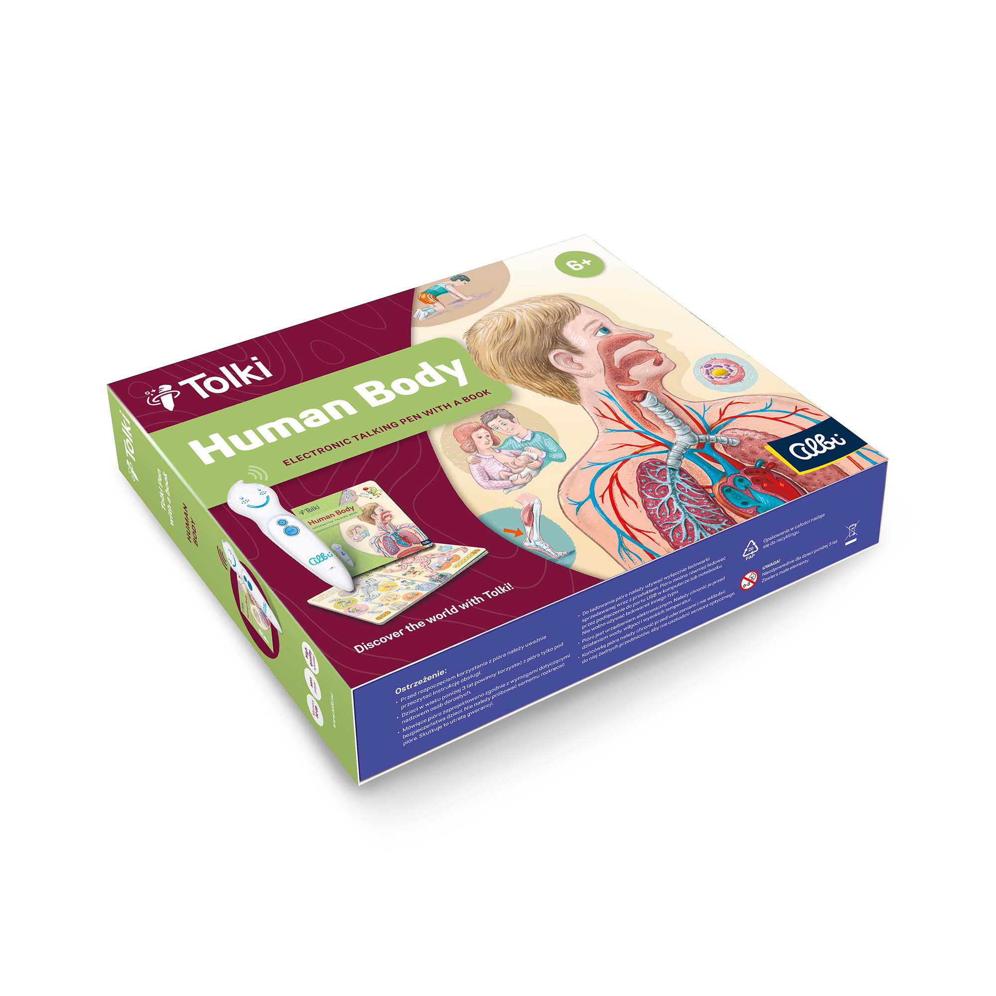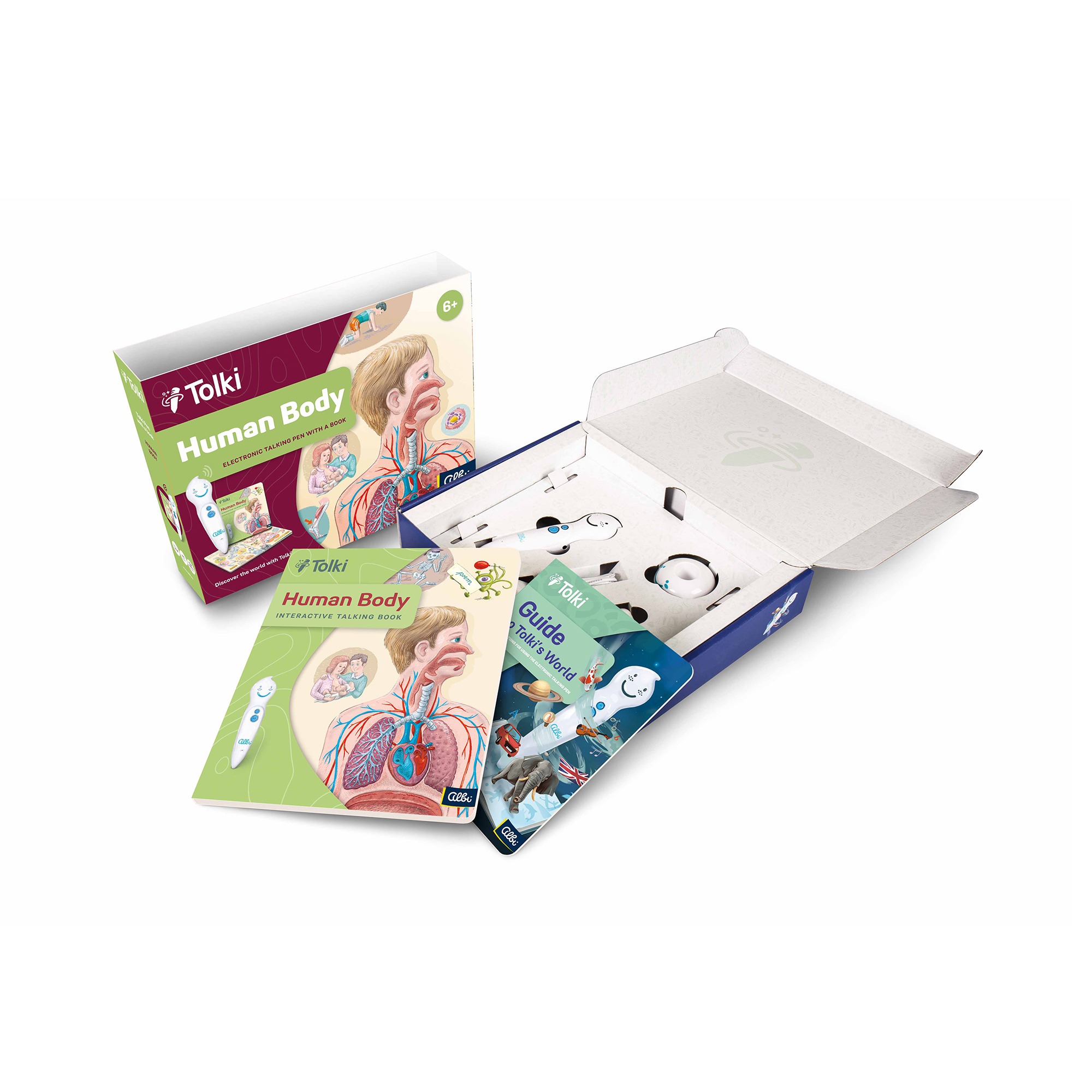 Supersaver set: Tolki pen + Human Body book for small children at a bargain price On your adventure through the Human Body book, you will be accompanied by a little alien called Questin, who flew in from the planet Po and decided to explore the human body and all the fascinating and entertaining things you can find out about it. The character of Questin the alien and engaging illustrations encourage children to gradually discover individual parts and systems of the human body. Contents: over 2 000 sounds and texts. What is Tolki? Tolki is a unique educational concept giving children and adults alike the opportunity to learn lots of interesting and useful facts in a playful and engaging way that children will simply love! All you have to do is gently touch the picture or text with the interactive talking pen to hear the respective information, sound, or music. Playing with the interactive talking pen offers unlimited possibilities – not only can the pen read texts, sing songs, and play real sounds (a lion’s roar, birdsong, vehicle sounds etc.), but you can also use it to play various games and quizzes. The set includes: Tolki the Electronic Talking Pen, Human Body book, 32 GB SD card, charger, USB cable, Guide to the Tolki World, headphone jack (headphones are not included). Technical specifications: 32 GB memory, USB 2.0, high-speed connection, Li-ion battery, built-in rechargeable 365 mA / 3.7 V, charger, 500 mA / 5V, compatible with Windows OS.