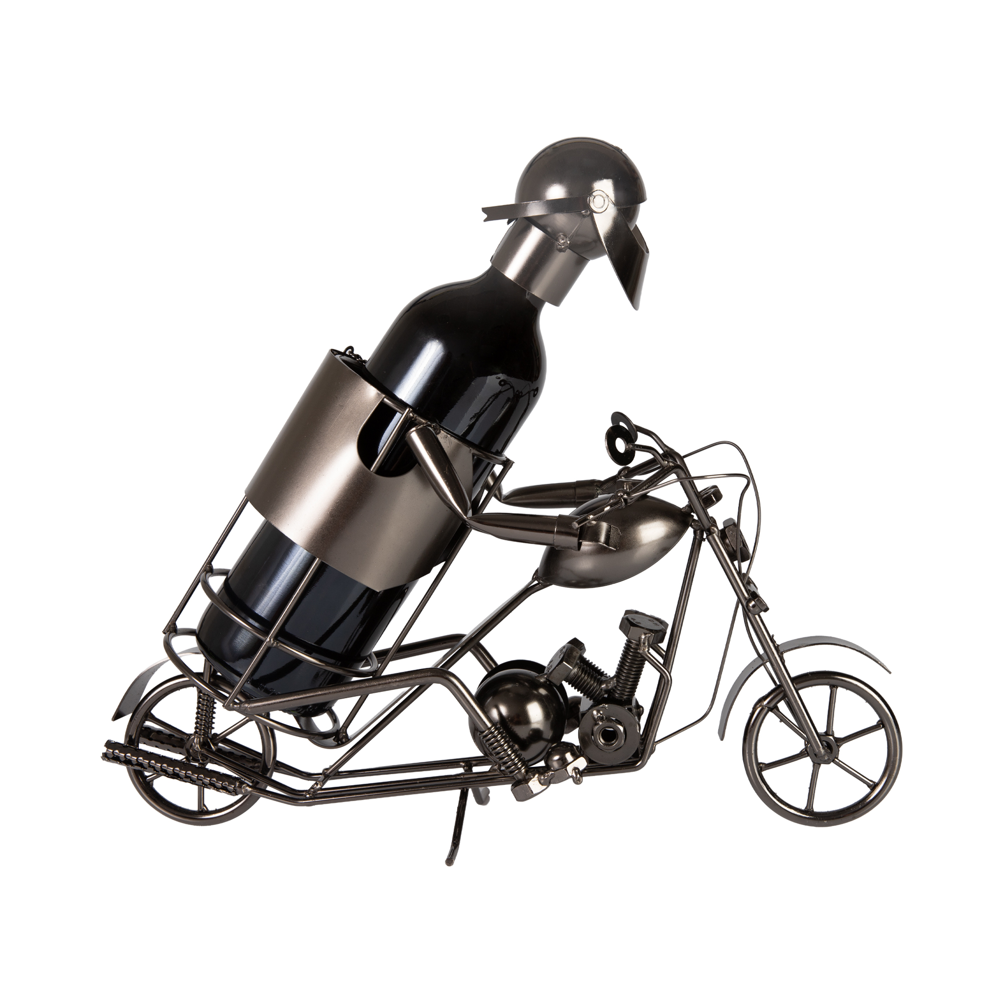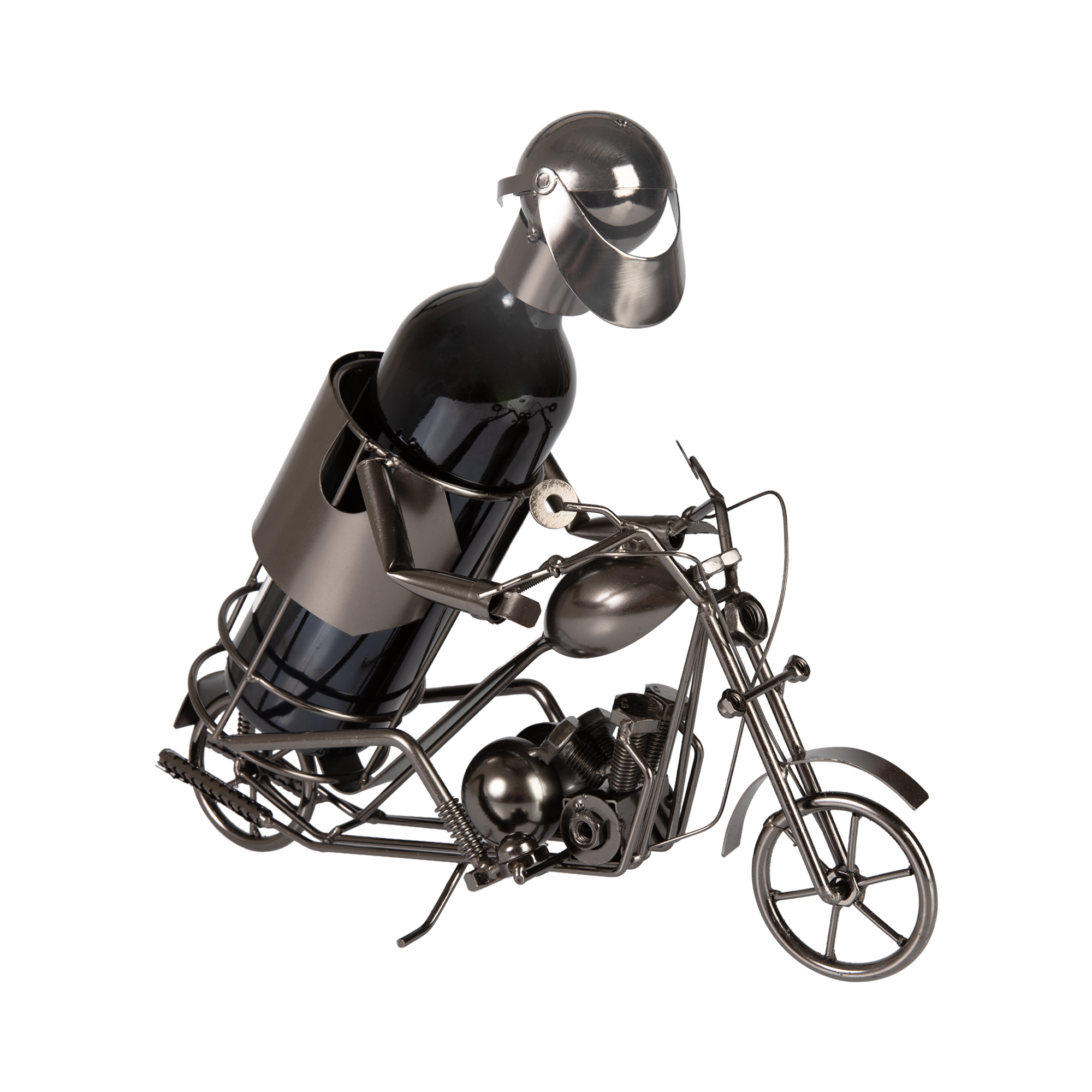 Máte koupené víno jako dárek a přemýšlíte, jak ho jedinečně zabalit? Vyměňte klasickou dárkovou tašku za designový stojan na láhev, který je i netradičním bytovým doplňkem, jež v interiéru zaujme. Motiv motorkáře potěší všechny drsňáky. Univerzální velikost stojanu zajišťuje, že se do stojanu vejde většina lahví běžných rozměrů. Materiál: kov Průměr otvoru na láhev: 8,5 cm Přibližné rozměry stojanu: 36,5 × 22,5 × 15 cm