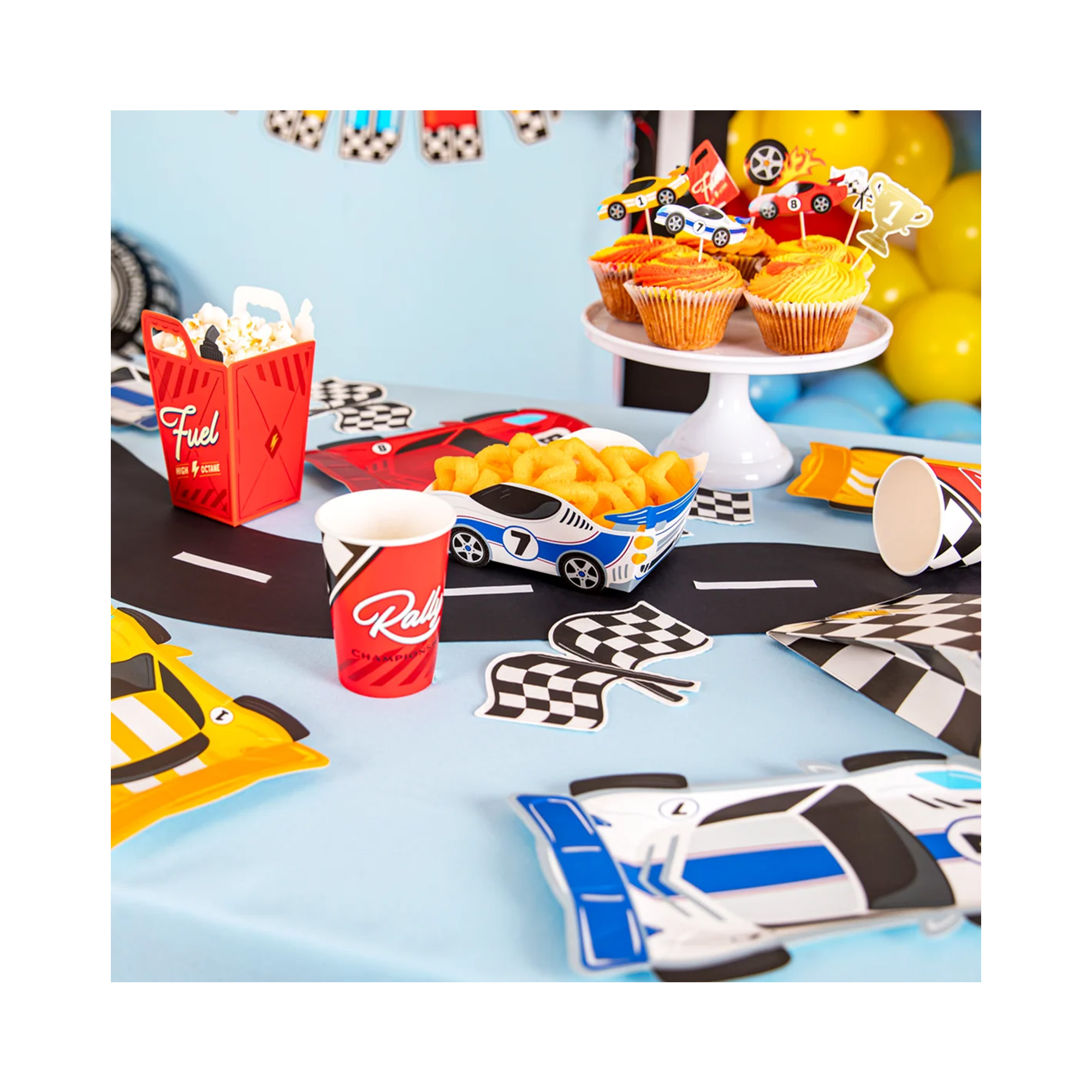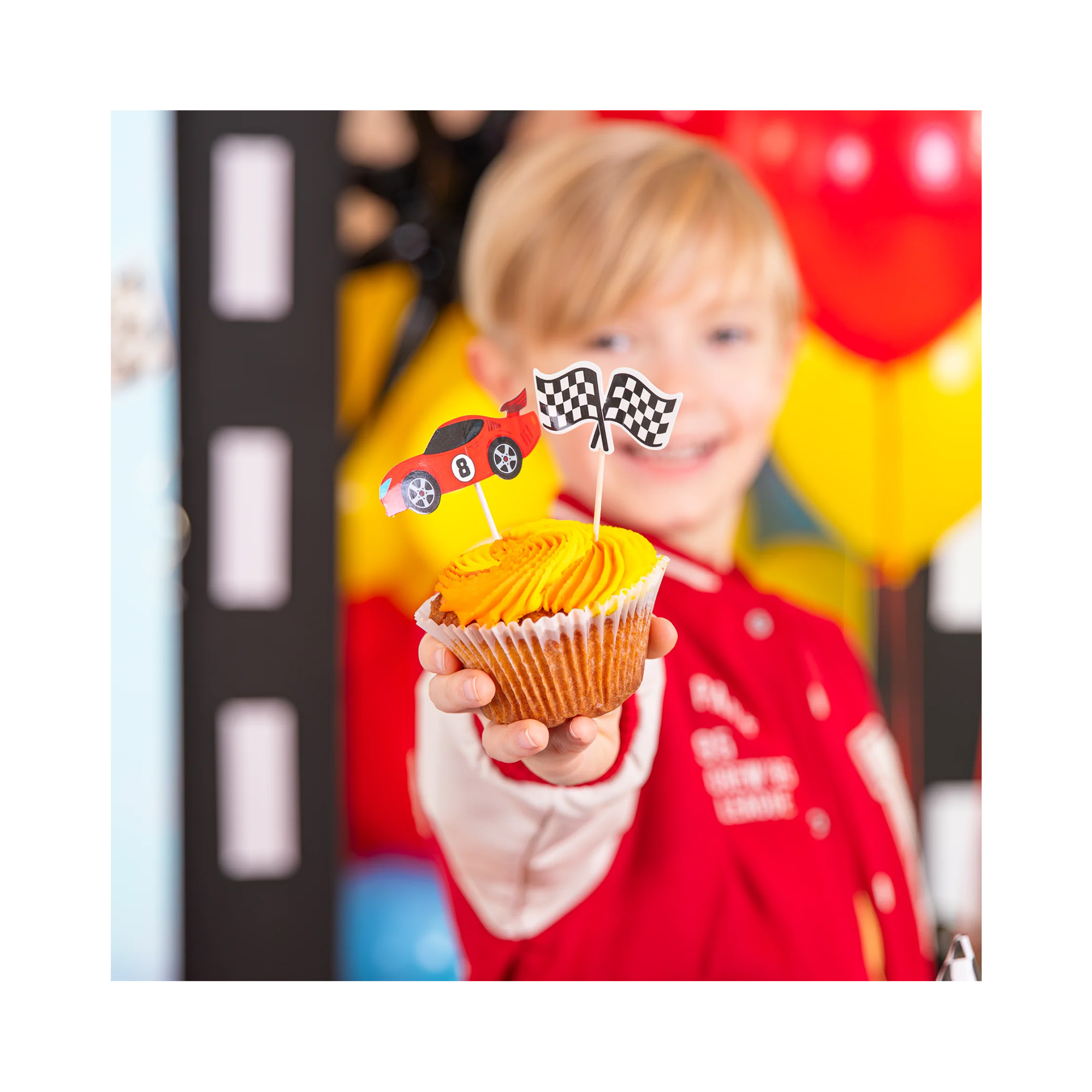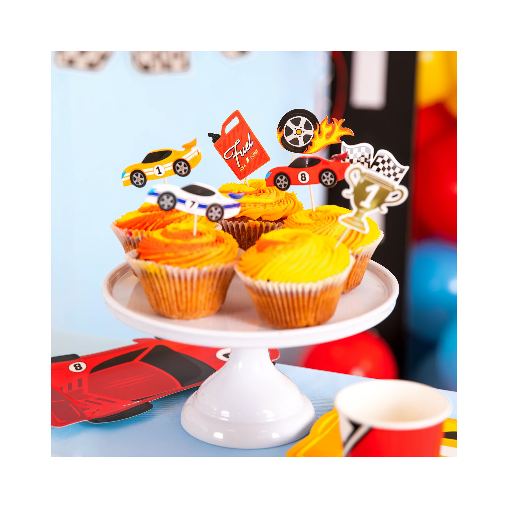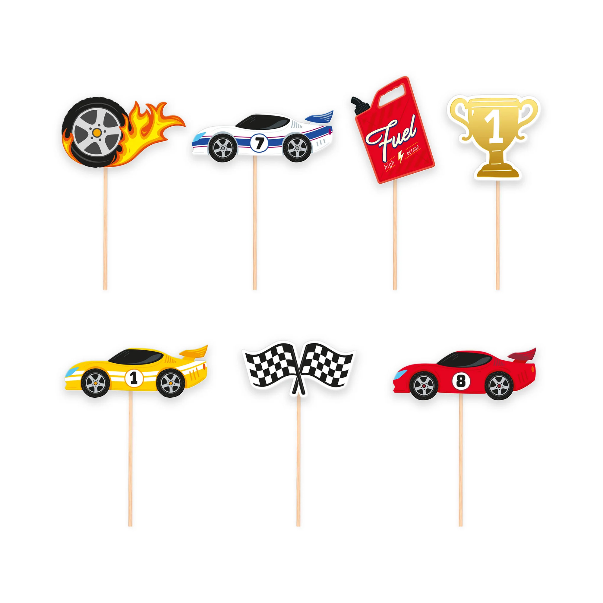 Sada sedmi zápichů laděných do závodního stylu je originální ozdobou na cupcaky a další dobroty, vhodnou pro tematickou chlapeckou oslavu. Balení obsahuje tři zápichy s motivem závodních aut (ve žluté, bílé a červené barvě) a po jednom motivu rychlého kola, poháru, kanystru s palivem a závodních vlajek. Tyto zápichy jsou součástí kolekce Závodní auta a potěší všechny, kterým je blízké téma formulí, rally a rychlých kol. Skvělý doplněk dekorace pro tematickou narozeninovou oslavu nebo párty! Další závodní párty doplňky a dekorace najdete v naší kategorii Auta/stavba. Výška zápichu: cca 10,5 cm Balení obsahuje: 7 ks zápichů s dřevěnými špejlemi