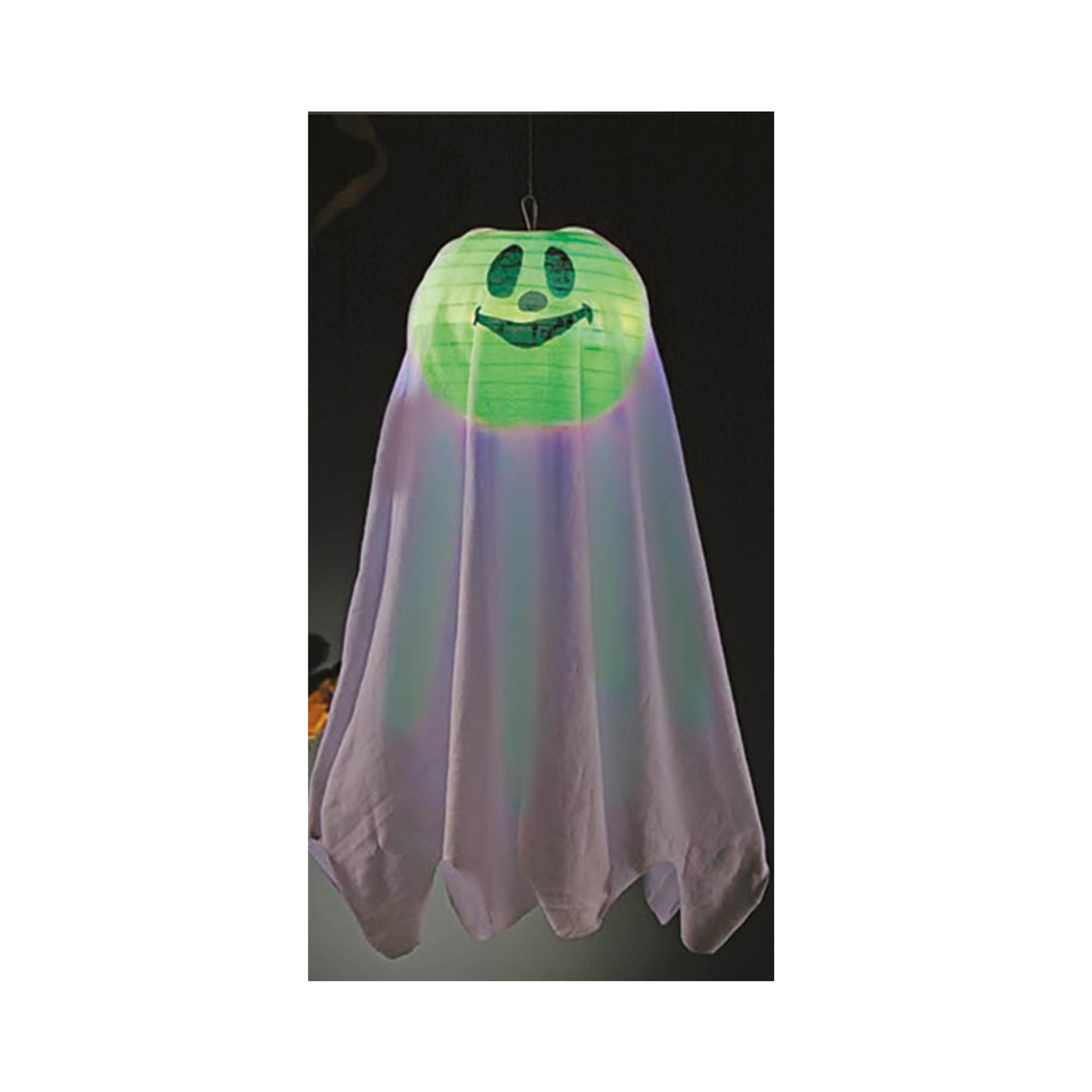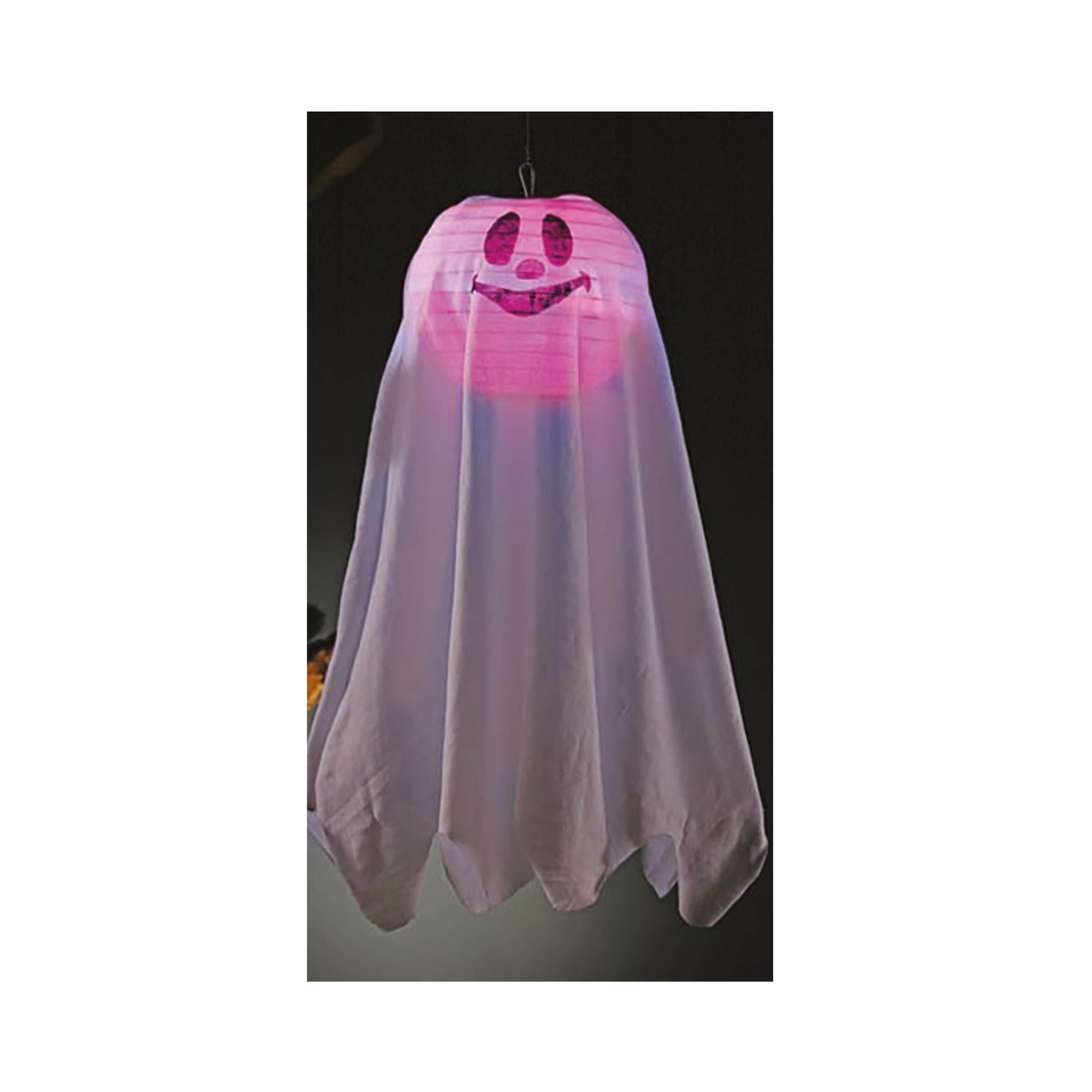 Svítící duch je poutavá závěsná dekorace, kterou využijete na Halloween nebo strašidelných párty. Duch je vyroben z bílé látky s plastovou výstuhou uprostřed a zabudovaným LED světlem. Po zapnutí osvětlení se v pravidelných intervalech mění čtyři barvy. Celý strašidelný efekt dotváří potisk obličeje na látce. Zavěste dekoraci do prostoru, zhasněte světla a vychutnejte si děsivou atmosféru. Pro další párty doplňky a dekorace se strašidelným motivem můžete navštívit naši tematickou kategorii Halloween. Materiál: polyester, PVC Výška: 60 cm Napájení: AG3 baterie (součást balení) Balení obsahuje: látka s plastovou výstuhou a LED světlo na baterie Lampion není součástí balení.